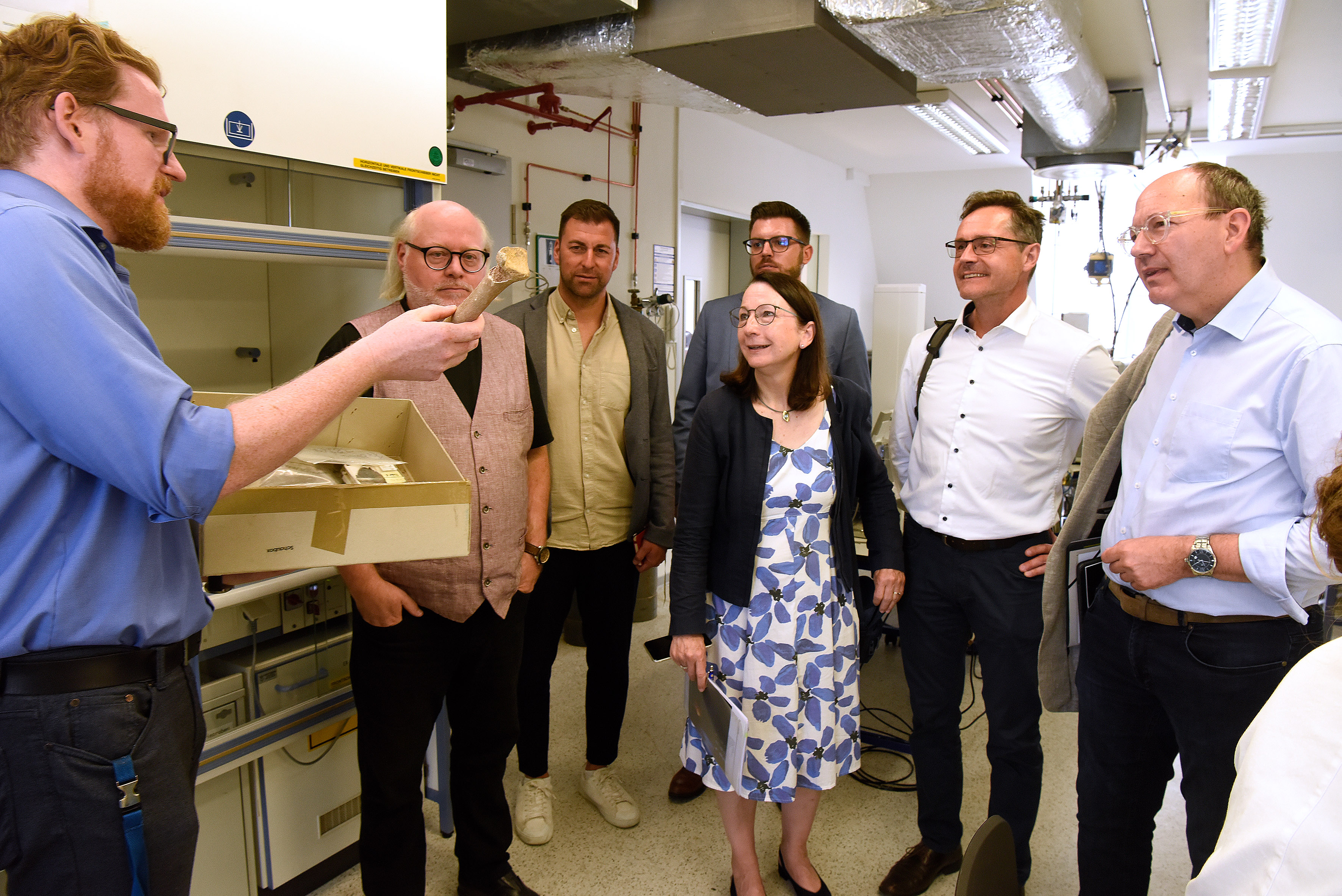 Um einen genaueren Einblick in die Arbeit der Teams zu bekommen durften die Gäste einige Labore in C4 und D6 besichtigen, die teilweise hohen Sicherheitsvorkehrungen unterliegen, um Verschmutzungen auszuschließen. „Erst kürzlich haben wir einen zweiten Teilchenbeschleuniger einkaufen können“, stellt Wiegand das neueste Technikhighlight vor: „Damit sind wir bestens für die nächsten Jahre aufgestellt.“