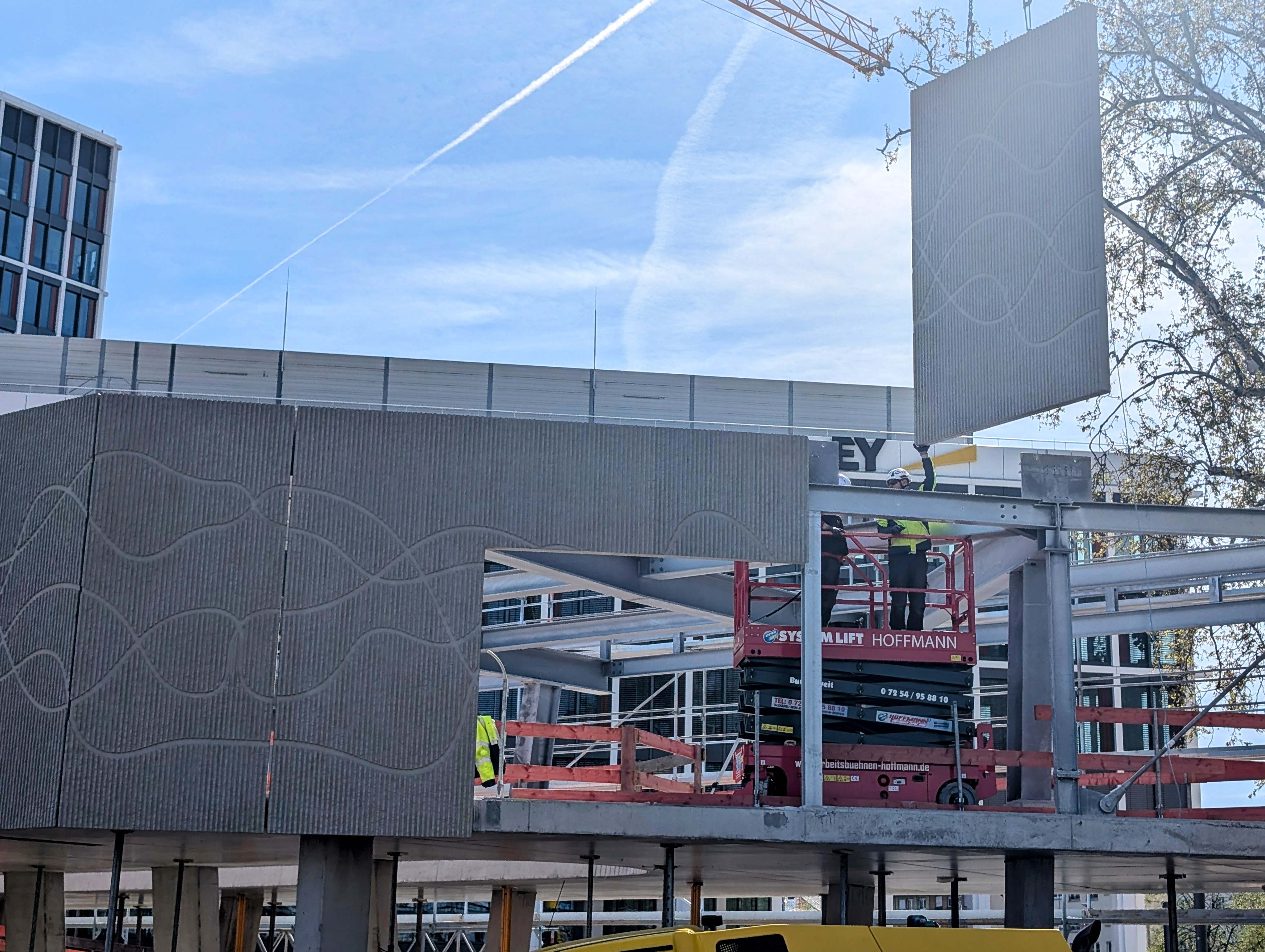 Nun wurde ein wichtiger Meilenstein erreicht: Der Rohbau ist beendet, die Arbeiten am Dach und an der Fassade sind gestartet. Vor Ostern konnten die Beton-Fassadenelemente auf der Nord- und Westseite des Gebäudes erfolgreich angebracht werden. Durch gute Planung und Abstimmung im Vorfeld und mit Präzisionsarbeit ist es gelungen, den Einbau mittels mobilem Kran innerhalb einer Woche fristgerecht und ohne Beeinträchtigung des Verkehrs auf der B36 durchzuführen. Die neue Fassade ist nun von den Bahnsteigen eindrucksvoll zu sehen.