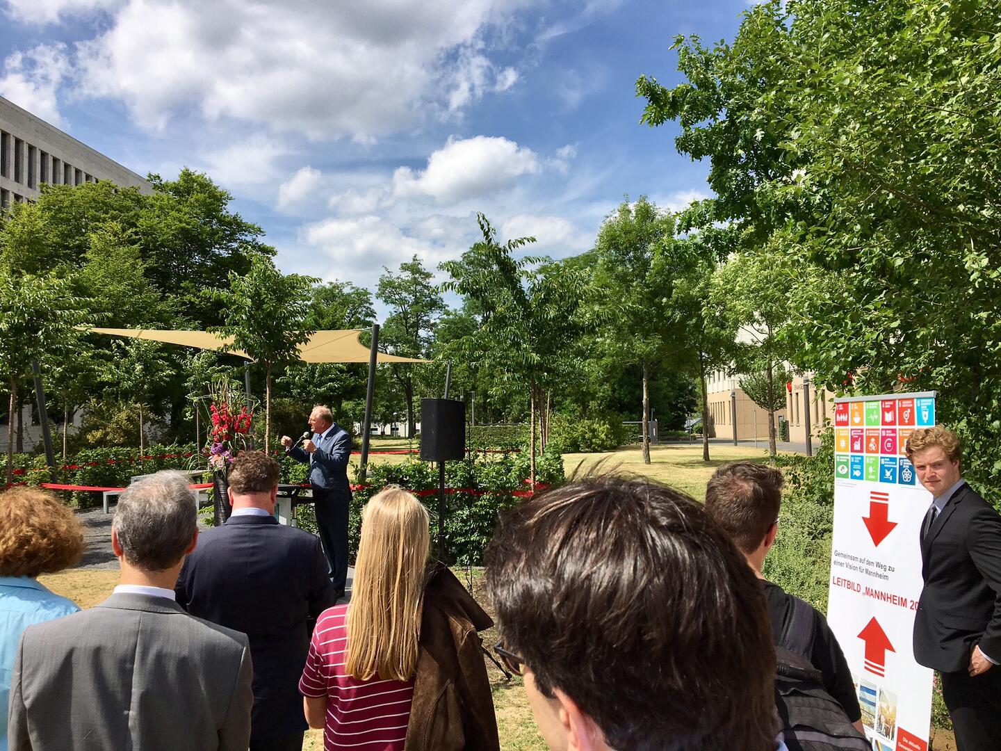 Hans-Joachim Fuchtel, Parlamentarischer Staatssekretär beim Bundesminister für wirtschaftliche Zusammenarbeit und Entwicklung, eröffnete den im Freien gelegenen nachhaltigen Hörsaal feierlich und wies in seinem Grußwort auf die Dringlichkeit der Umsetzung der globalen Nachhaltigkeitsziele, der Sustainable Development Goals (SDG), in Deutschland sowie in den deutschen Kommunen und Institutionen hin. Im Rahmen der Eröffnungsveranstaltung besuchte Staatssekretär Fuchtel auch den Stand der Stadt Mannheim und informierte sich über den laufenden Leitbildprozess und die weitere Entwicklung mit dem Ziel der kommunalen Umsetzung der globalen Nachhaltigkeitsagenda und der SDG auf kommunaler Ebene in Mannheim.