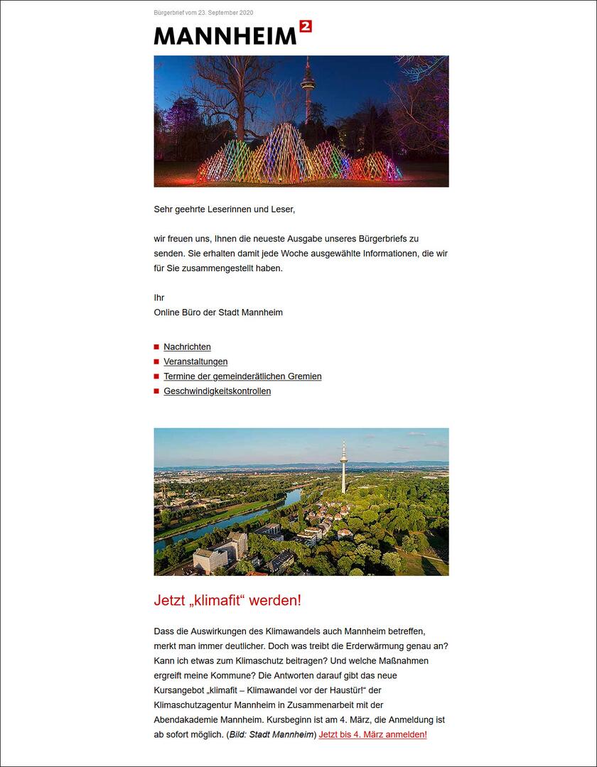 In unserem wöchentlich erscheinenden Bürgerbrief informieren wir Sie aktuell über wichtige Themen für Mannheim, Vorhaben der Stadtverwaltung, Termine der städtischen Gremien, Baustellen und Verkehrsbehinderungen, Radarkontrollen, bevorstehende Veranstaltungen und Weiteres mehr - kurz: wir halten Sie immer auf dem Laufenden.