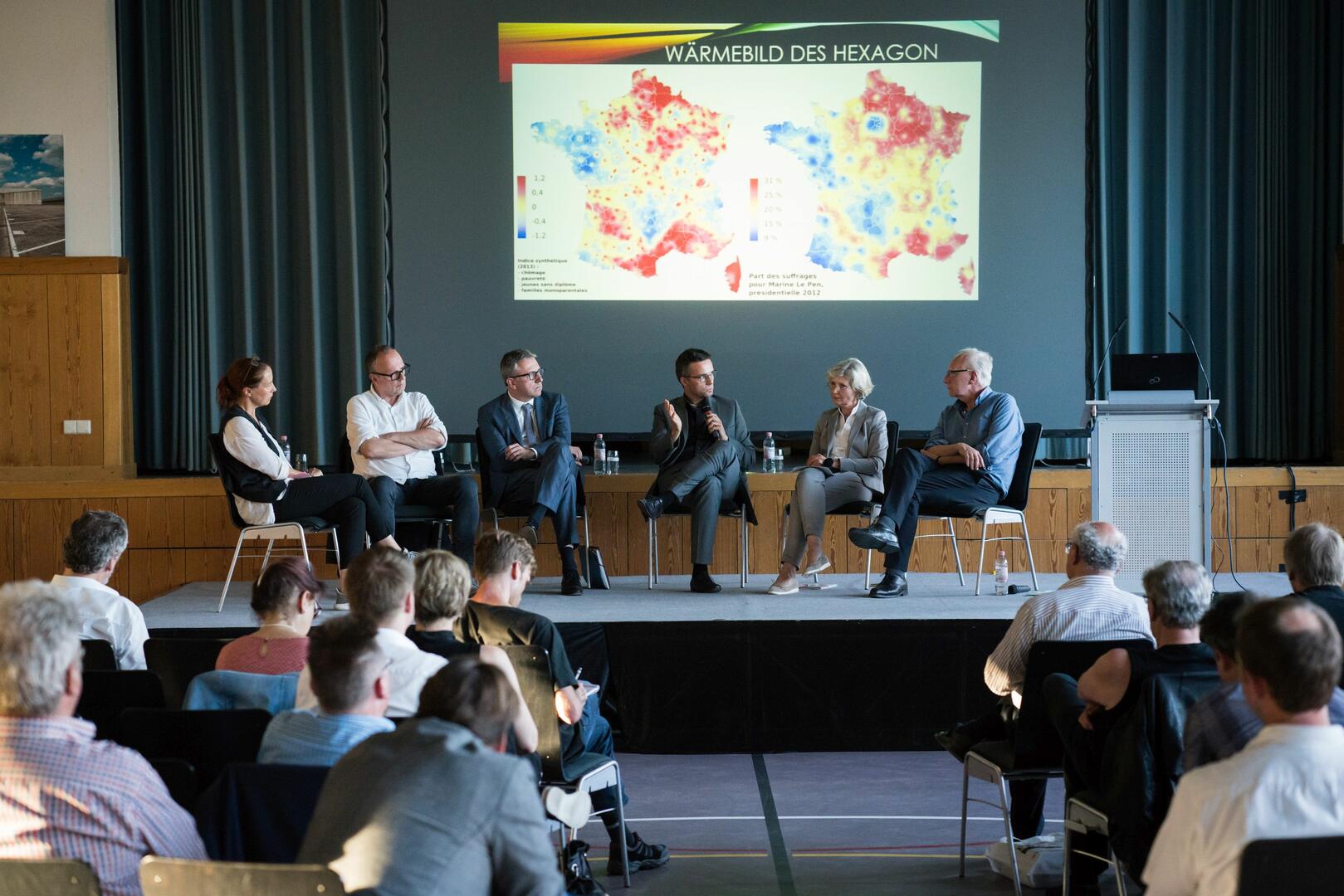 Im zweiten Teil seines Vortrags widmete sich Claus Leggewie den Präsidentschaftswahlen in Frankreich. Seine wahlsoziologischen Ableitungen machten deutlich, dass nicht von einem generellen Stadt-Land-Gefälle gesprochen werden kann. Weder gebe es den ländlichen Raum allgemein als „Lepenistan“ noch den städtischen Raum als „Macronie“. Vielmehr entscheide sich das Wahlverhalten kleinräumig innerhalb dieser Gebiete und entlang der Kategorien Bildung, Alter und Berufsstand. Einen weiteren zentralen Unterschied machte der passionierte Frankreich-Experte deutlich: Zwar weisen sowohl Le Pen als auch Macron eine Zuordnung in ein Spektrum rechter und linker Parteien von sich. Doch während das „ni droite ni gauche“ (frz.: „weder rechts noch links“) des Front National eindeutig als historische Referenz auf die konservative Konterrevolution zu Zeiten der Dritten Republik Frankreichs und als Anti-System-Politik zu verstehen sei, zeige sich die Bewegung Macrons hingegen als gesellschaftsoffen, gesprächsbereit und versöhnend.