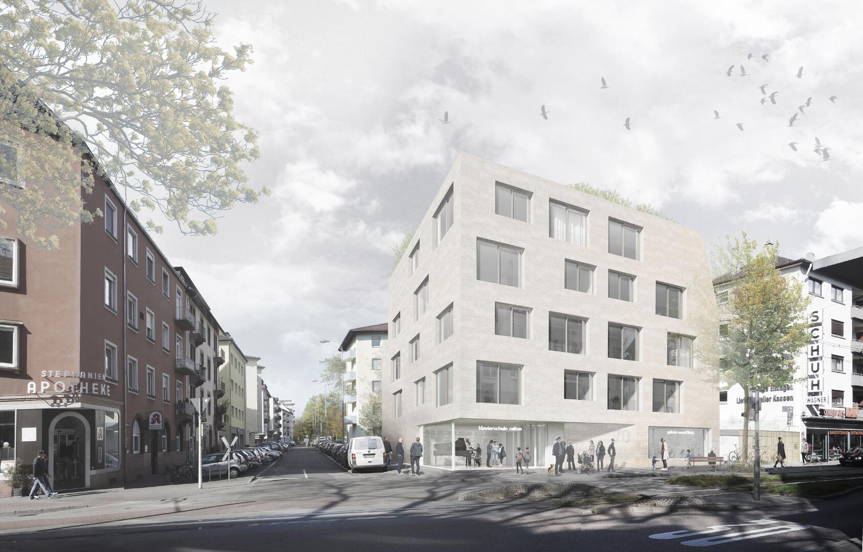 Die Räume im Erdgeschoss öffnen sich zur Meerfeldstraße hin mit großzügigen Fenstern, welche sich im Sommer weitestgehend öffnen lassen und so eine Anbindung zur Freifläche und somit ins Quartier, ermöglichen.