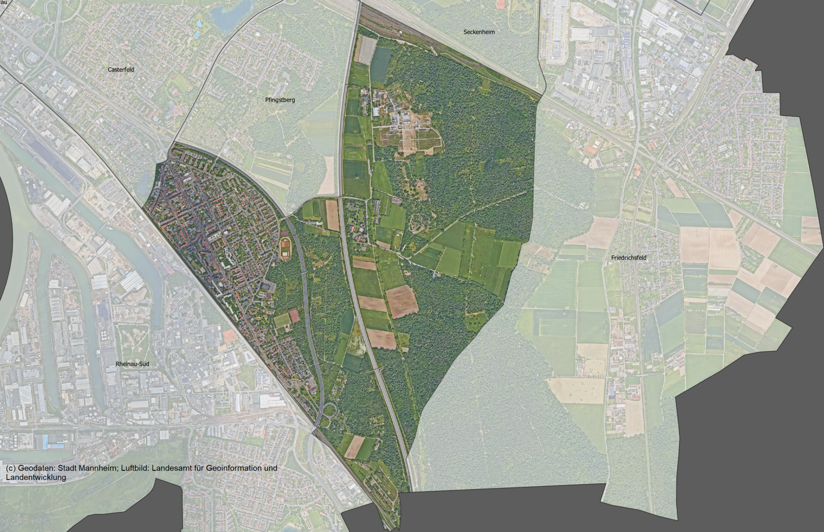 - Größe ca. 4,9 km² - entspricht etwa 700 Fußballfeldern und macht etwa 3,4 Prozent der Gesamtfläche Mannheims aus. 24 Prozent der Fläche des Stadtteils sind versiegelt.