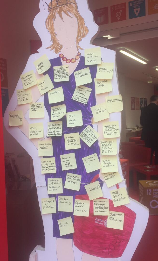 Zum Maimarkt hatte das Amt der Gleichstellungsbeauftragten daher „Wunschfrauen“ mitgebracht – übergroße Frauen-Silhouetten aus buntbemalter Pappe - auf denen die Besucherinnen und Besucher ihre Wünsche und Ideen für ein gleichberechtigtes Mannheim im Jahr 2030 anbringen und sich somit unmittelbar am Leitbildprozess beteiligen konnten. 84 Bürgerinnen und Bürger haben mitgemacht und die „Wunschfrauen“ mit ihren persönlichen Anregungen und Wünschen dekoriert. Besonders häufig waren Anmerkungen nach bezahlbaren Wohnraum, mehr Sicherheit und Sauberkeit vertreten. Doch auch „Gleichberechtigt leben!“, „Echte Gleichberechtigung“, „Kindergarten kostenfrei“, „Mehr und gute Radwege“, „Abends bessere Straßenbahnverbindung“ waren als Wünsche aufgeführt. Es gab auch einen Wunsch der das Amt der Gleichstellungsbeauftragten direkt betrifft, nämlich „Das Büro der Gleichstellungsbeauftragten sollte auch für die Tochtergesellschaften der Stadt Mannheim zuständig sein“. Alle Beiträge werden nun in den Prozess der Leitbild-Erstellung und die Arbeit der Gleichstellungsbeauftragten einfließen.