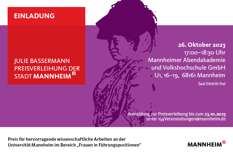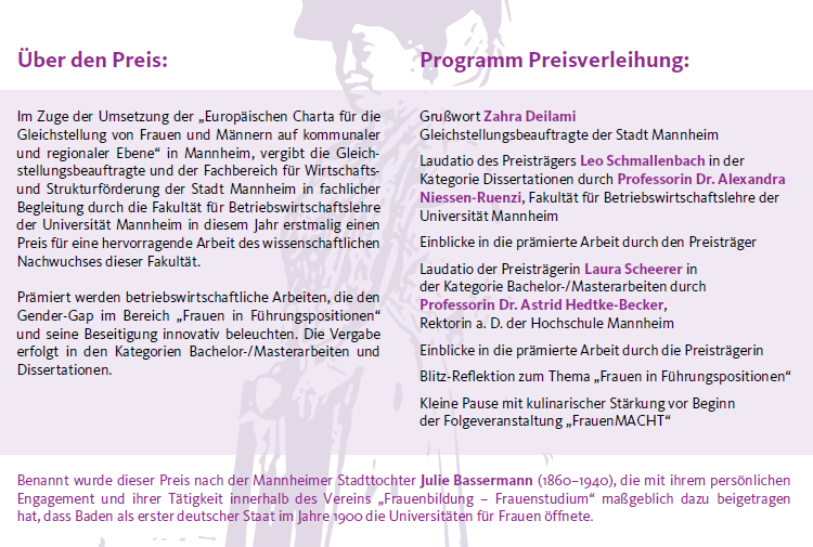 Im Zuge der Umsetzung der „Europäischen Charta für die Gleichstellung von Frauen und Männern auf kommunaler und regionaler Ebene“ in Mannheim, vergibt die Gleichstellungsbeauftragte und der Fachbereich für Wirtschafts- und Strukturförderung der Stadt Mannheim in fachlicher Begleitung durch die Fakultät für Betriebswirtschaftslehre der Universität Mannheim in diesem Jahr erstmalig einen Preis für eine hervorragende Arbeit des wissenschaftlichen Nachwuchses dieser Fakultät.
