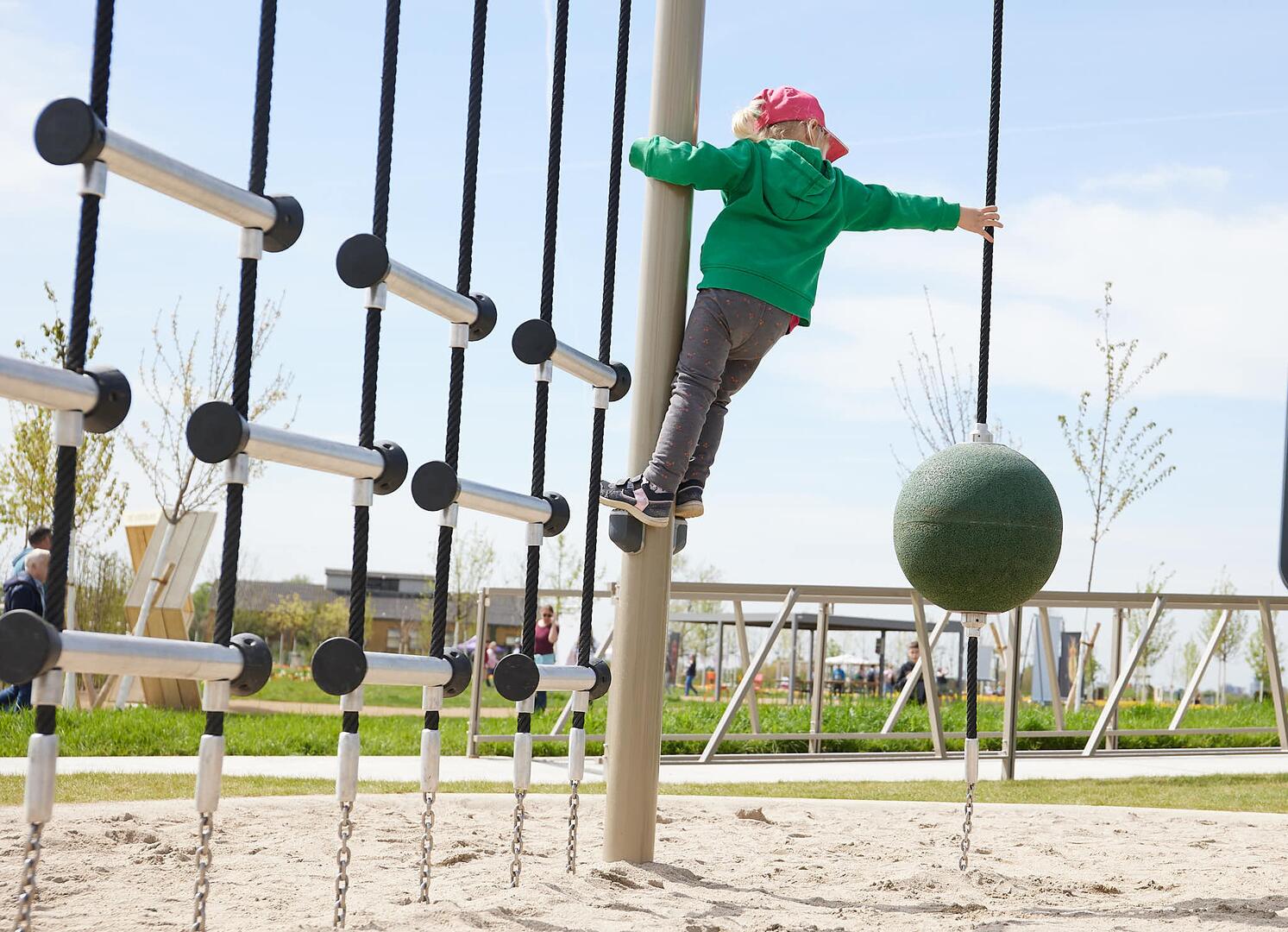 Die Themen der Spielstationen erinnern an Mannheim und seine Erfindungen. Die Spielstation „Vernetzung“ führt Sie auf einen Steg, von dem aus Sie weit über das Spinelli-Gelände sehen können.