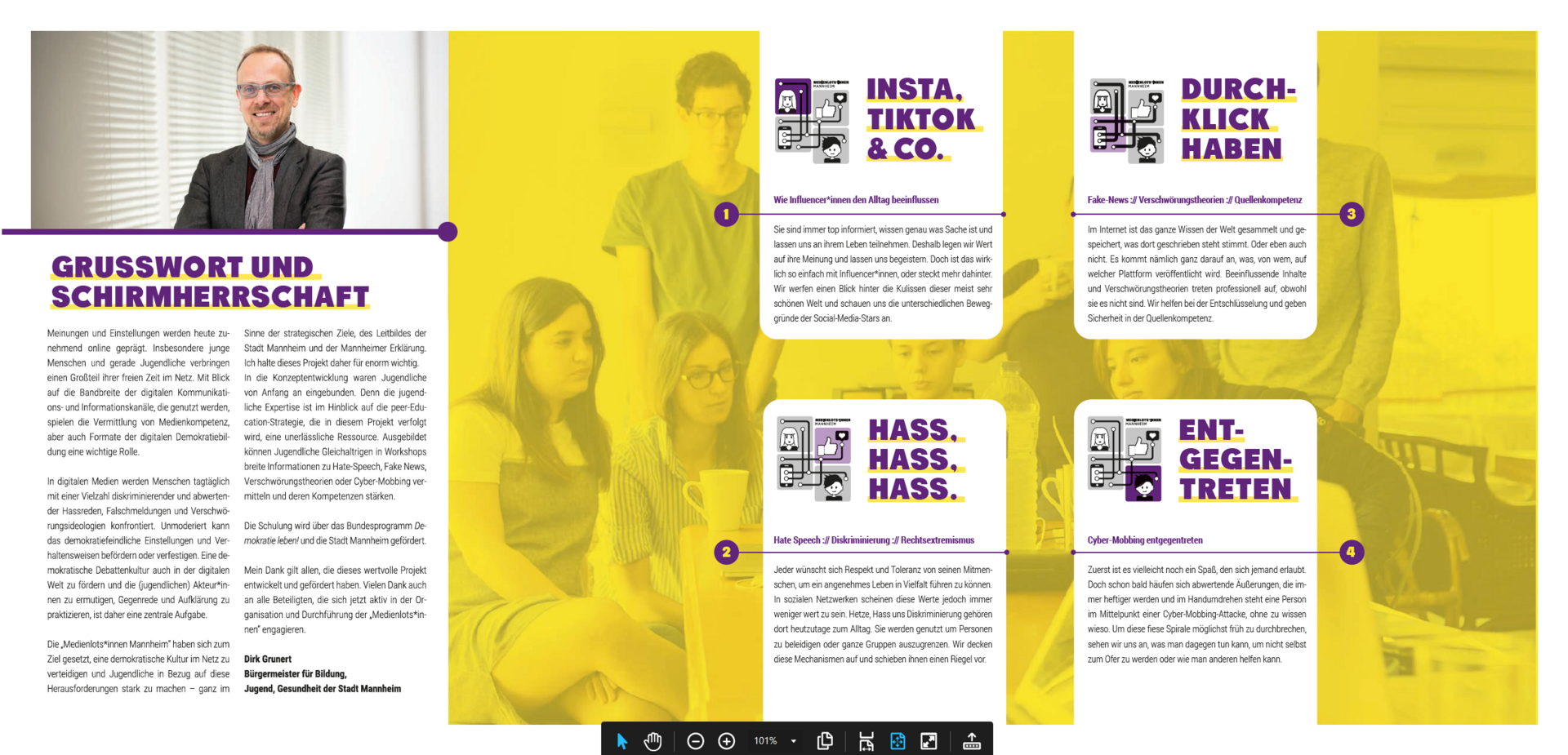 Projektbeschreibung: Die einander.Themeninsel „Medienlots*innen Mannheim“ wirkt demokratiefeindlichen Tendenzen im Internet entgegenwirkt und fördert ein respektvolles Miteinander im digitalen Raum. Hierzu wird ein im Vorjahr entwickeltes Schulungskonzept umgesetzt, das digitale Demokratiekompetenzen von Jugendlichen und junge Erwachsene als Multiplikator*innen stärkt.