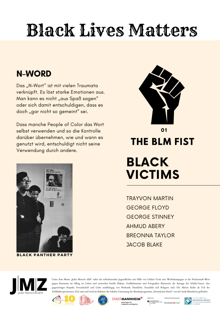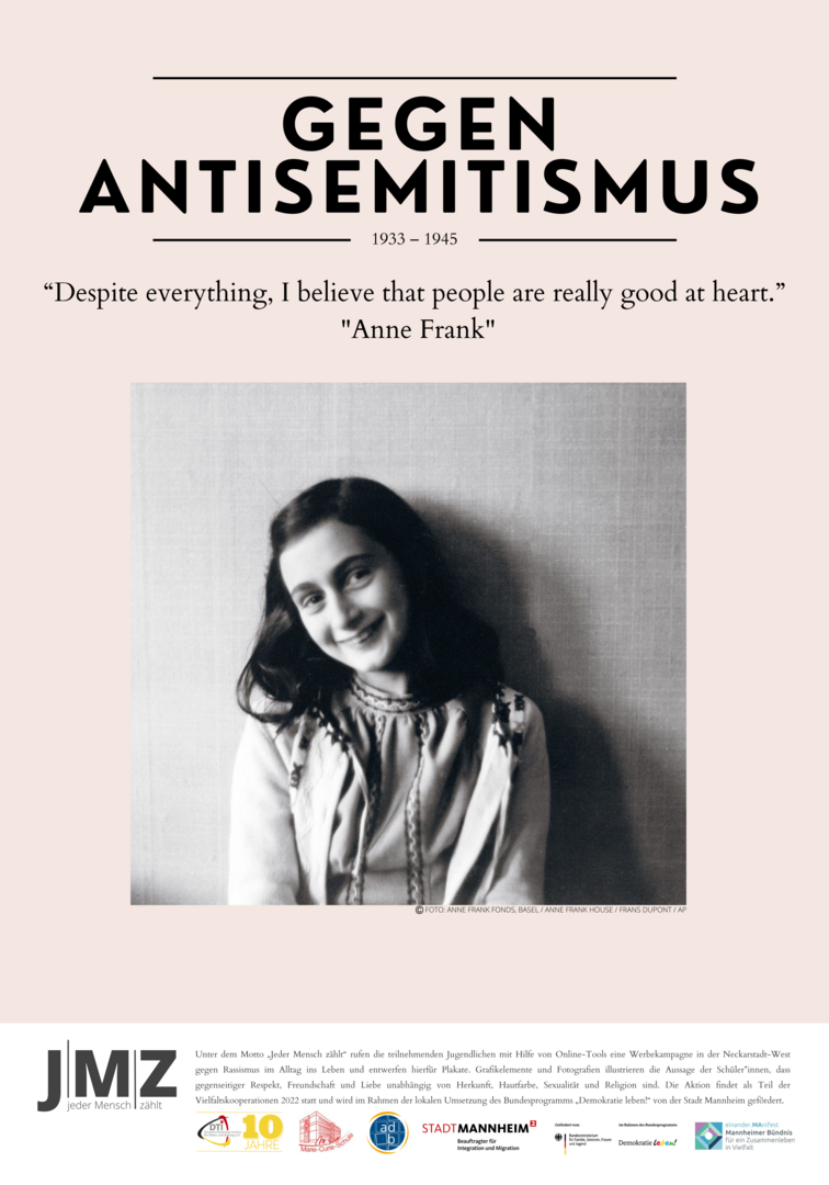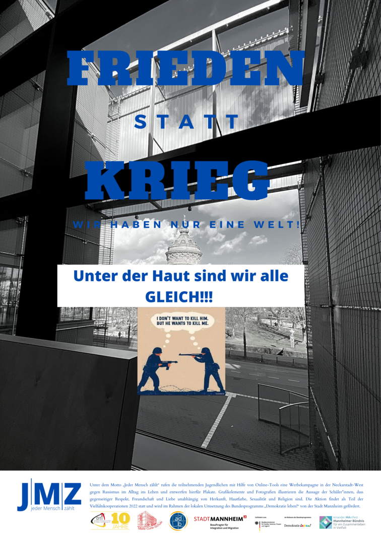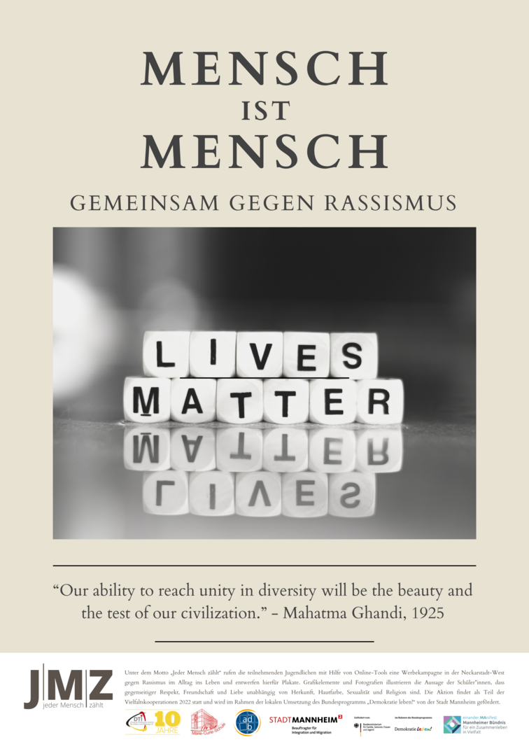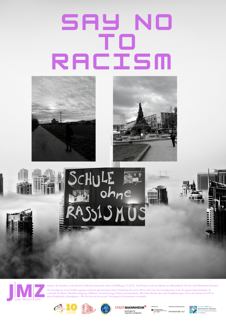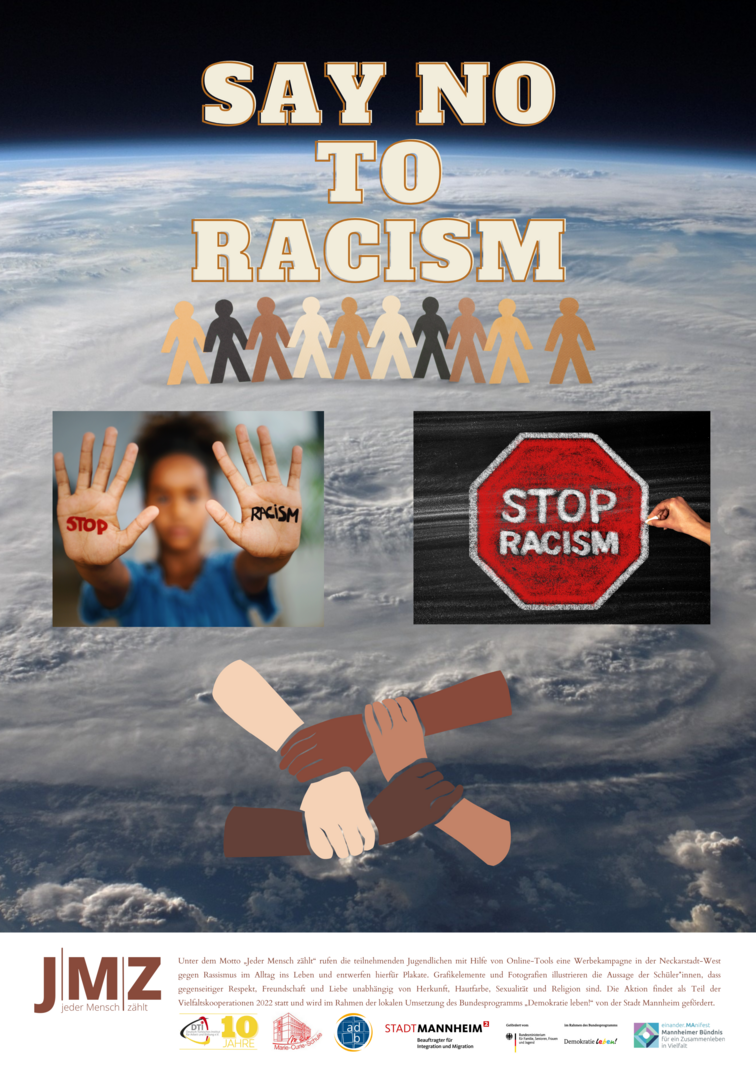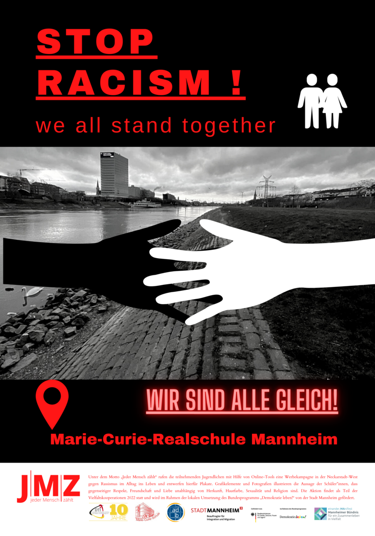 Im Projekt setzen sich Schüler*innen der Marie-Curie-Schule in der Neckarstadt-West kritisch mit Rassismus und Antiziganismus auseinander. Hierzu entwickeln und setzen die genannten Kooperationspartner*innen für die Kulturwochen der Schule im Februar 2022 ein vielfältiges Programm zu den Themen Rassismus und Antiziganismus um. Das Projekt zielt darauf, Schüler*innen frühzeitig für rassifizierte Muster von Diskriminierung zu sensibilisieren und zugleich Unsichtbarkeiten der Geschichte von Sinti und Roma entgegenzuwirken. Zugleich sollen Jugendliche Formate gleichberechtigter, gesellschaftlicher Teilhabe beispielsweise in Jugendverbänden oder in Quartiersstrukturen kennenlernen. Somit stehen zum einen Sensibilisierung und Engagement gegen Diskriminierung, zum anderen die Förderung von jugendlicher Teilhabe und Empowerment vielfältiger jugendlicher Perspektiven im Vordergrund. Im Rahmen des Projekts entwickelten die Schüler*innen eine eigene Plakatkampagne.