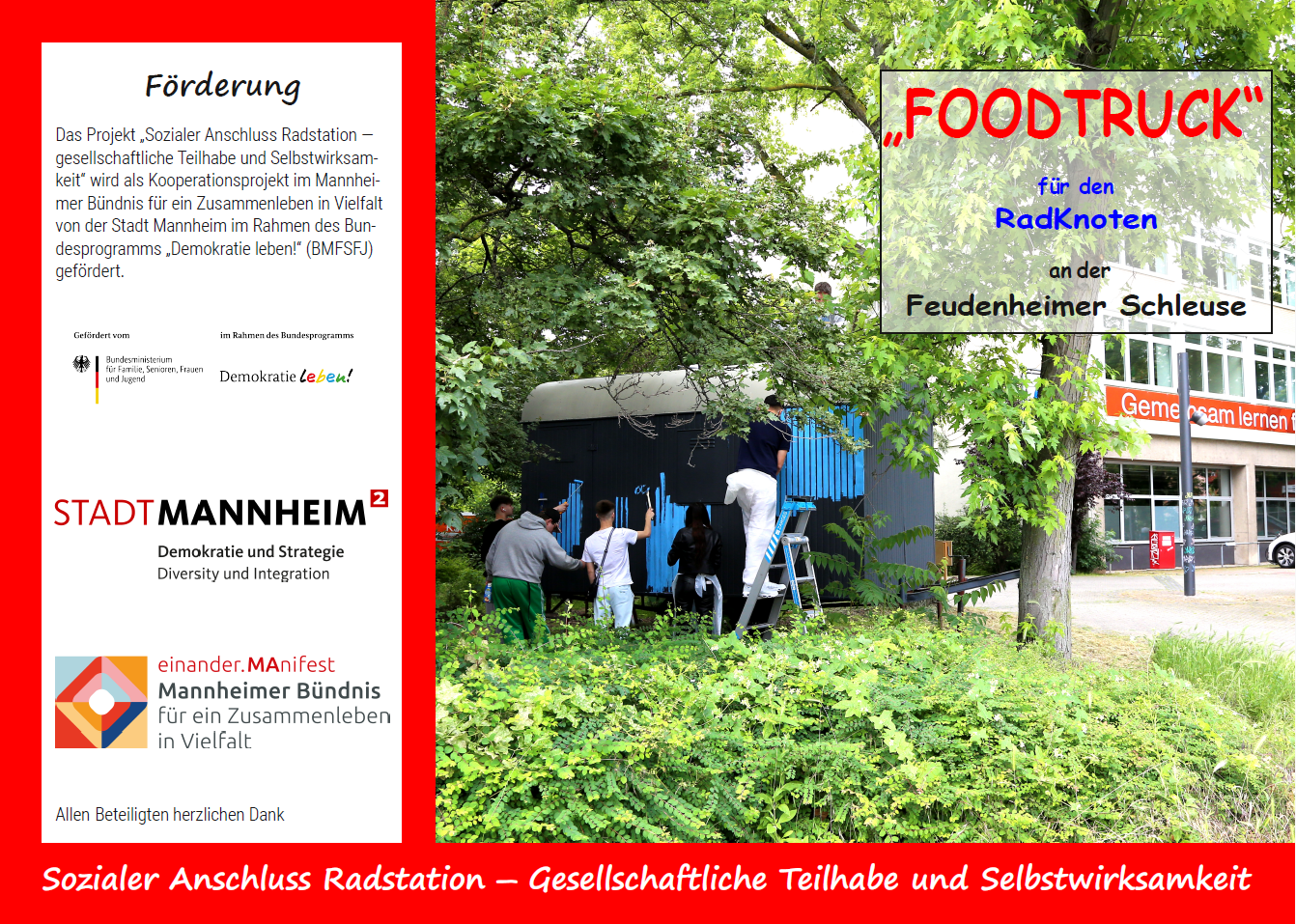 Projektbeschreibung: Vielfalt lebt von Aktionen, von Zusammenwirken und von Begegnungen verschiedener Menschen unterschiedlichen Alters, Herkunft, Glaube, Geschlecht, sonstiger Orientierung und vieles mehr. Das Kooperationsprojekt hat zum Ziel, mit einer Vielzahl von unterschiedlen Mitmach- und Begegnungsaktionen im Stadtteil Schönau die dort lebenden Menschen zusammenzuführen und Vielfalt positiv erlebbar zu machen. Dabei stehen die Werte des gegenseitigen Respekts und des gemeinsamen Handelns im Vordergrund. Durch die Einbindung verschiedener Zielgruppen aus dem Stadtteil stärkt des Projekt das Wir-Gefühl auf der Schönau und fördert den Zusammenhalt im Quartier.- Sozialer Anschluss Radstation: Gesellschaftliche Teilhabe und Selbstwirksamkeit (2024)