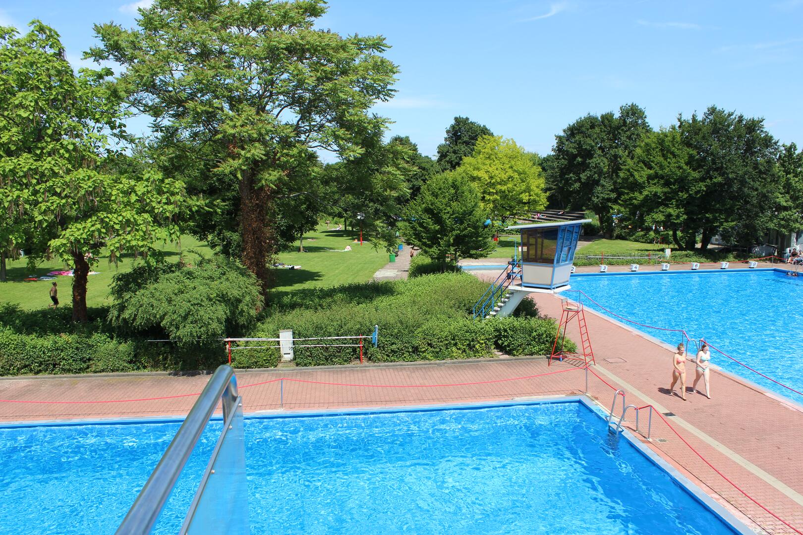 - Schwimmerbecken: 8 x 50 m-Bahnen, Wassertiefe 1,7 bis 2m