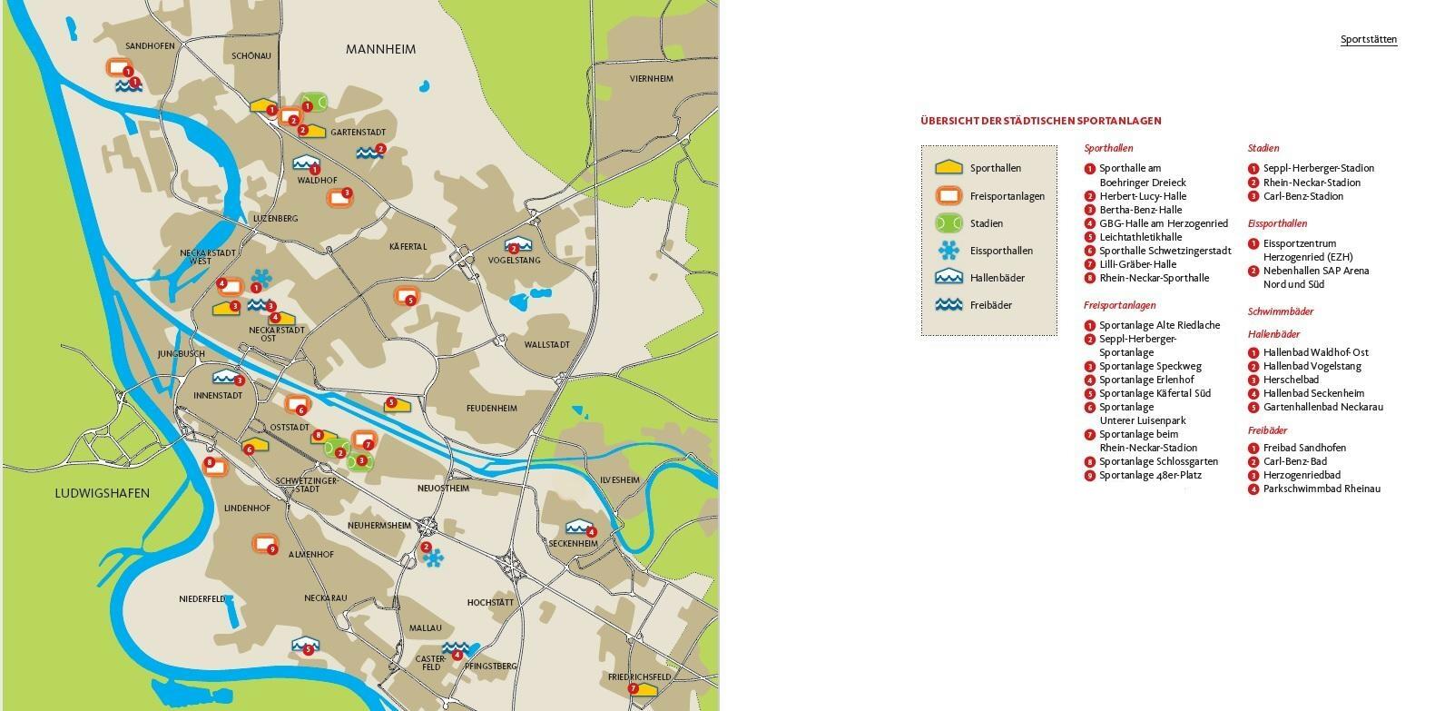 Die Stadt Mannheim unterhält zahlreiche solcher Einrichtungen und Anlagen. Zu den Sportstätten im Zuständigkeitsbereich des Fachbereichs 52 „Sport und Freizeit“ gehören: