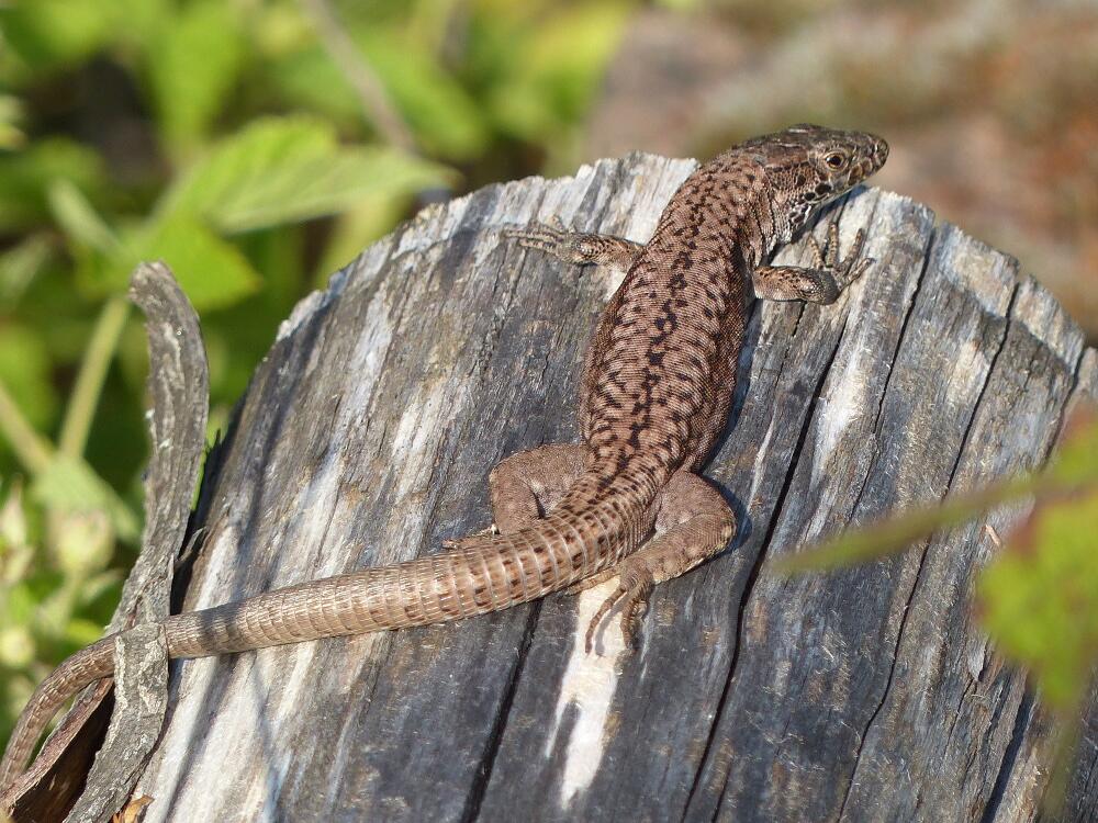 - Mauereidechse: Abgeflachter Körper, hell- bis mittelbraun oder grau, langer Schwanz