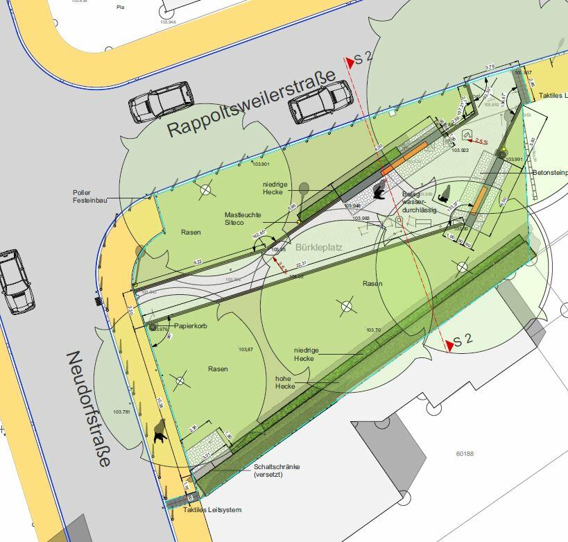 Die vorhandene Brunnenanlage wurde in den letzten Jahren saniert und wird in die Platzgestaltung einbezogen. Das vorhandene Denkmal soll an seiner jetzigen Stelle verbleiben. Der Platz wird mit drei neuen Mastleuchten mit einer Lichtpunkthöhe von ca. 5 Metern ausgestattet und die vorhandene hohe Mastleuchte (10 Meter) wird durch eine neue große Mastleuchte ersetzt. Von der Vogesenstraße aus wird der Platz mit herausnehmbaren Pollern ausgestattet, so dass hier eine Befahrung möglich wird. Insgesamt werden entlang des Kreuzungsbereichs Vogesenstraße und Neudorfstraße Poller eingebaut, um eine weitergehende Platzbefahrung auszuschließen.