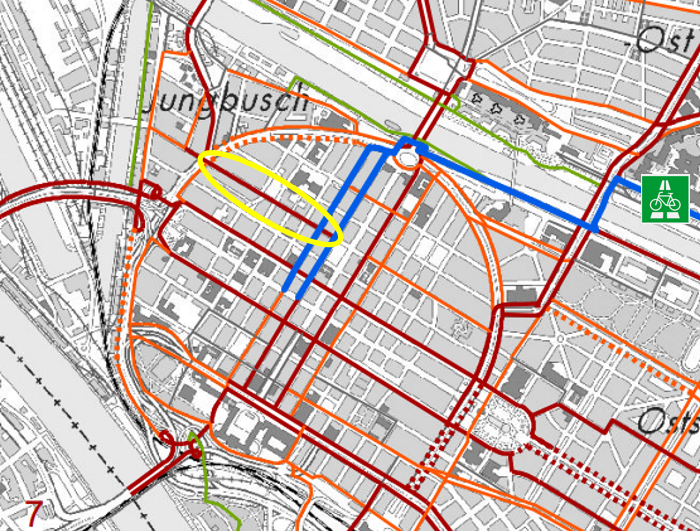 Die Straße G3/H3 – G7/H7 wird an allen Knotenpunkten zwischen G2/G3 und dem Luisenring mit Hinblick auf die wichtige Radverkehrsbeziehung von der Innenstadt in den Jungbusch bevorrechtigt.