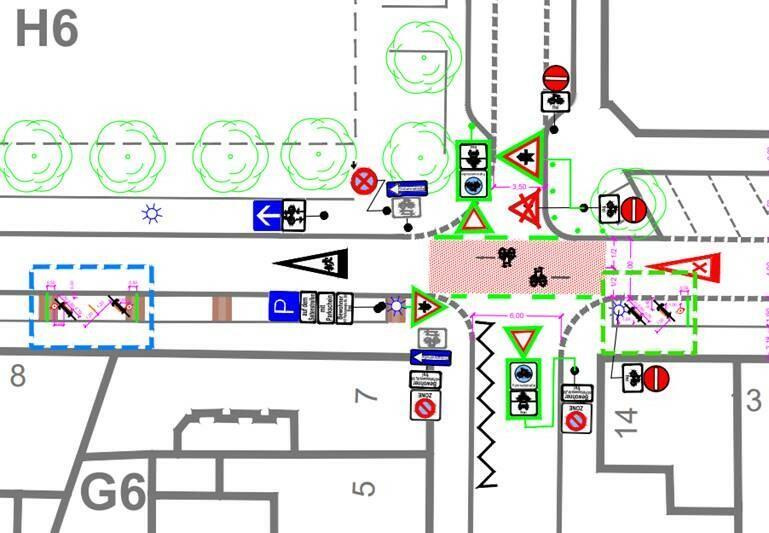 Da im Abschnitt G7/H7 der südliche Gehweg besonders eng ist, wird dieser durch den Wegfall von Parkständen sowie einen Einbau von Pollern auf 3,20m verbreitert.