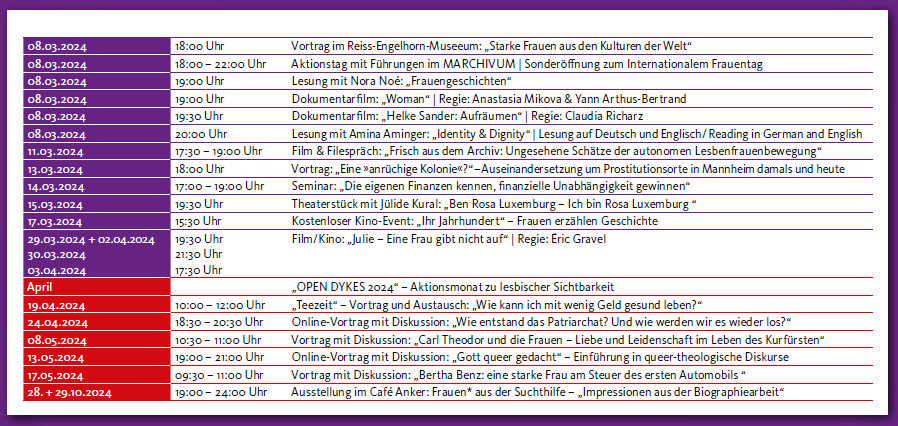 Der Veranstaltungskalender bietet verschiedenen Akteur*innen der (Stadt)Gesellschaft einen Ankündigungsraum für ihre Veranstaltungen, Aktionen, Lesungen und andere Begegnungsformate mit dem Thema Frauen und Gleichstellung im Mittelpunkt. Diese Ausgabe wurde anlässlich des Internationalen Frauentages am 08. März auch als Printbroschüre im Stadtgebiet verteilt.