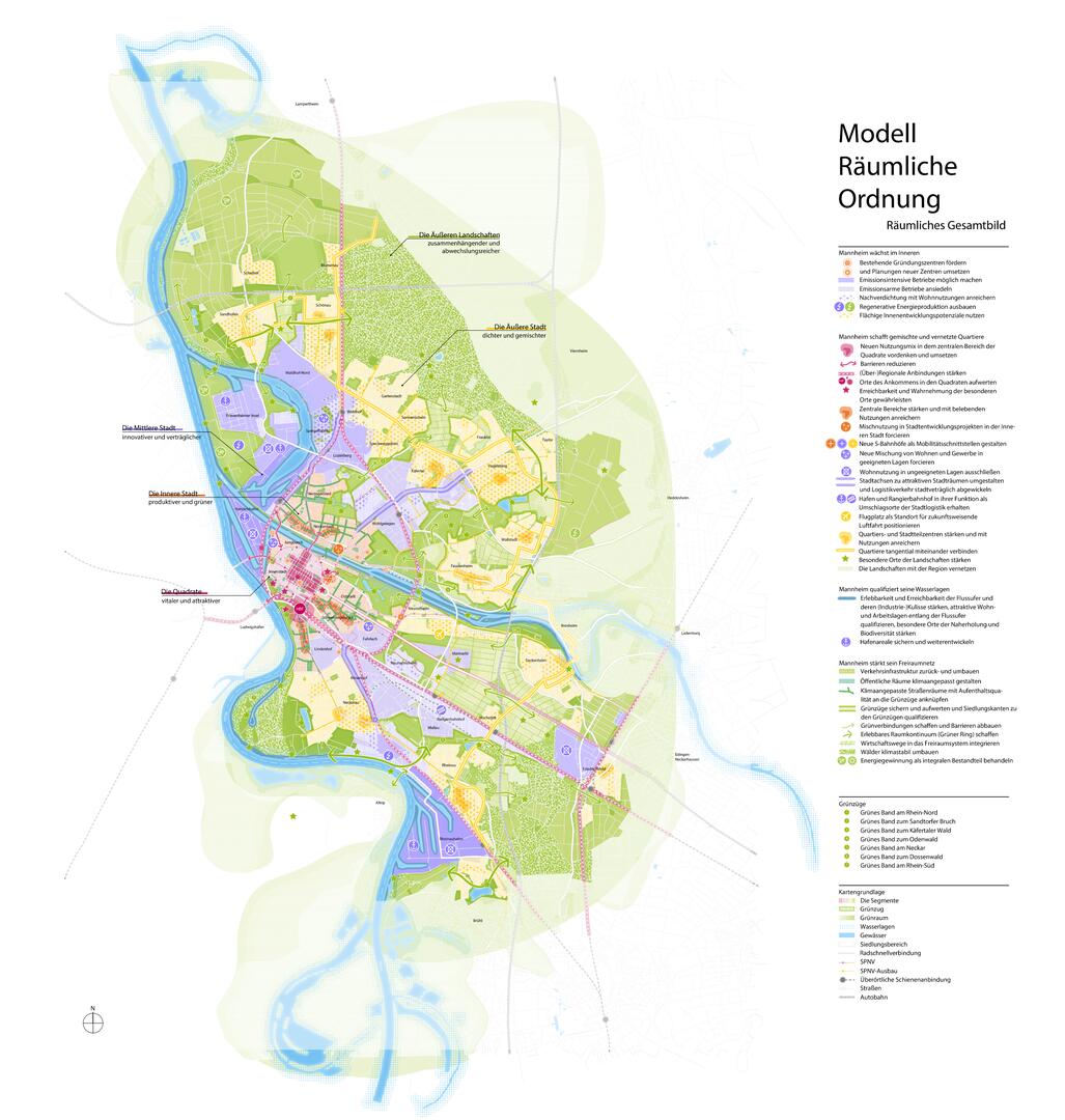 Die Querschnittsthemen gelten sowohl stadtweit, als auch in den identifizierten, strukturell ähnlichen städtischen Teilräumen, den sogenannten Stadtsegmenten. In den Stadtsegmenten bieten sich spezifische Chancen und Potenziale der Entwicklung je Querschnittsthema. Das räumliche Gesamtbild zeigt das idealtypische Gesamtbild der künftigen räumlichen Stadtentwicklung Mannheims. Flussläufe, Grünzüge, Mobilitätsinfrastruktur und Stadtsegmente bilden zusammen die für Mannheim typische und zukunftsweisende räumliche Grundstruktur.