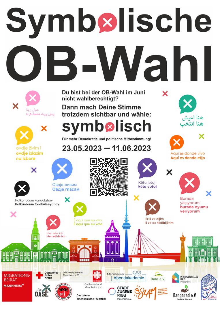 Am 18. Juni wählt Mannheim eine*n neue*n Oberbürgermeister*in. Doch fast 15 Prozent der Mannheimer*innen ab 16 Jahren sind von dieser Wahl ausgeschlossen, da sie keine deutsche oder EU-Staatsangehörigkeit haben und damit nicht wahlberechtigt sind. Ihre Stimme können sie trotzdem sichtbar machen – bei einer Symbolischen OB-Wahl, die der Mannheimer Migrationsbeirat gemeinsam mit Kooperationspartner*innen stadtweit organisiert: