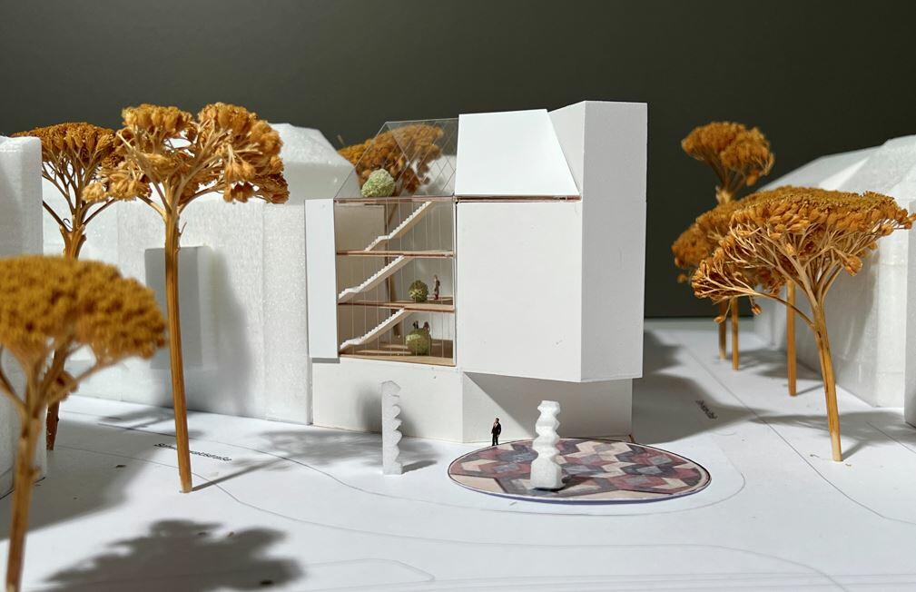 Der Entwurf besteht aus 2 Volumina, welche die Konturen der bisherigen Bebauung im Osten weiterführen und durch einen städtebaulich nachvollziehbaren Versatz nach vorne mit dem östlichen Block auf die Bauflucht der westlichen Gebäudekanten des Bestandes reagieren.