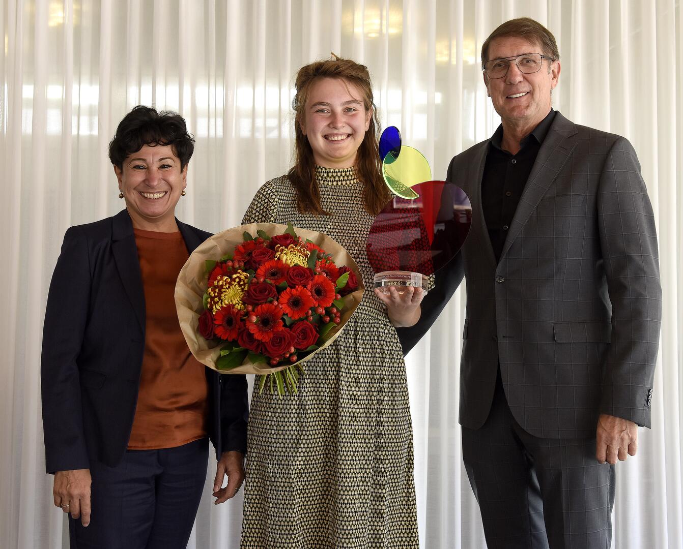 v.l.n.r.: Gleichstellungsbeauftragte Zahra Deilami, Gewinnerin des Helene Hecht-Nachwuchspreises Julla Kroner und Kulturbürgermeister Michael Grötsch.