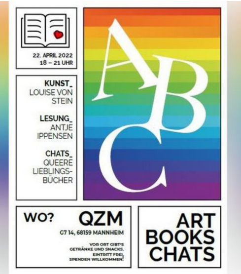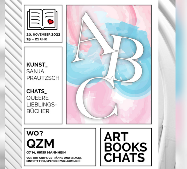 In den Jahren 2022 und 2023 haben wir das Thema Sichtbarkeit in Kunst und Kultur zum Schwerpunkt gewählt. Dazu haben wir im April und im November 2022 unter dem Motto „ABC – Art, Books & Chats“ zu Künstlerinnengesprächen, Buchvorstellungen und Austausch ins Queere Zentrum Mannheim eingeladen. Die beiden Veranstaltungen boten viel Gelegenheit zur Beschäftigung mit Kunst und Bücher von queeren Frauen und dem Austausch untereinander.