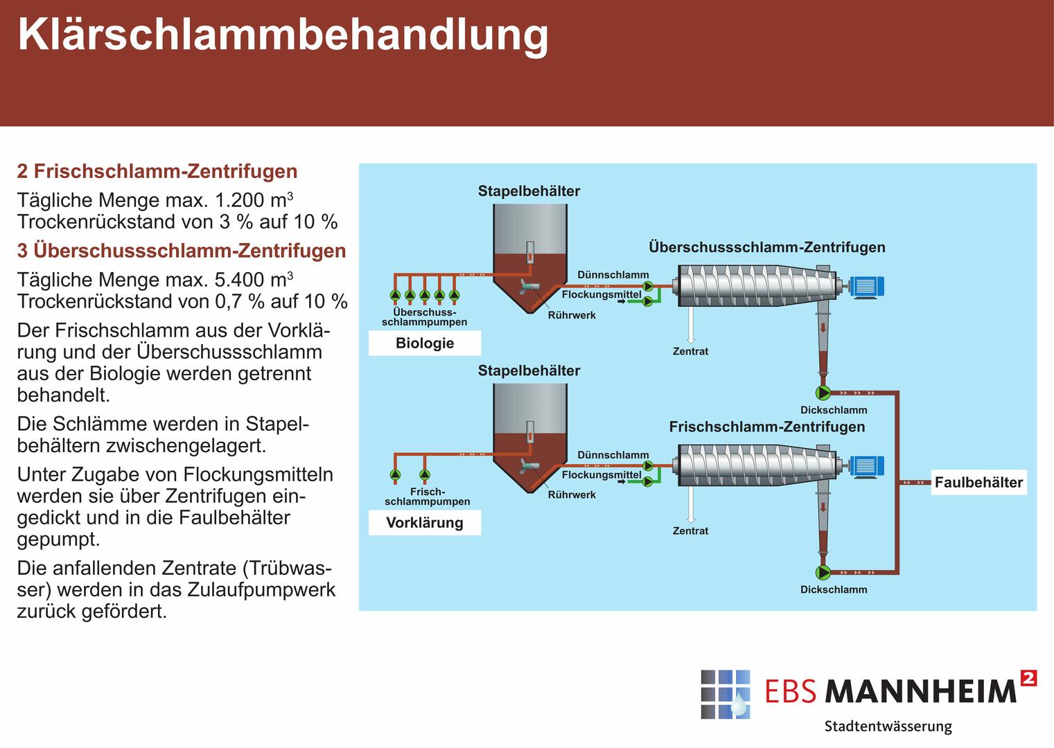 Das zentrale Klärwerk, nördlich von Sandhofen gelegen, reinigt täglich im Durchschnitt 81.000 m³ Abwasser aus Haushalten, Industrie und Gewerbe aus dem gesamten Stadtgebiet. Seine Größe ist auf 725.000 EW (Einwohnerwerte) ausgelegt.