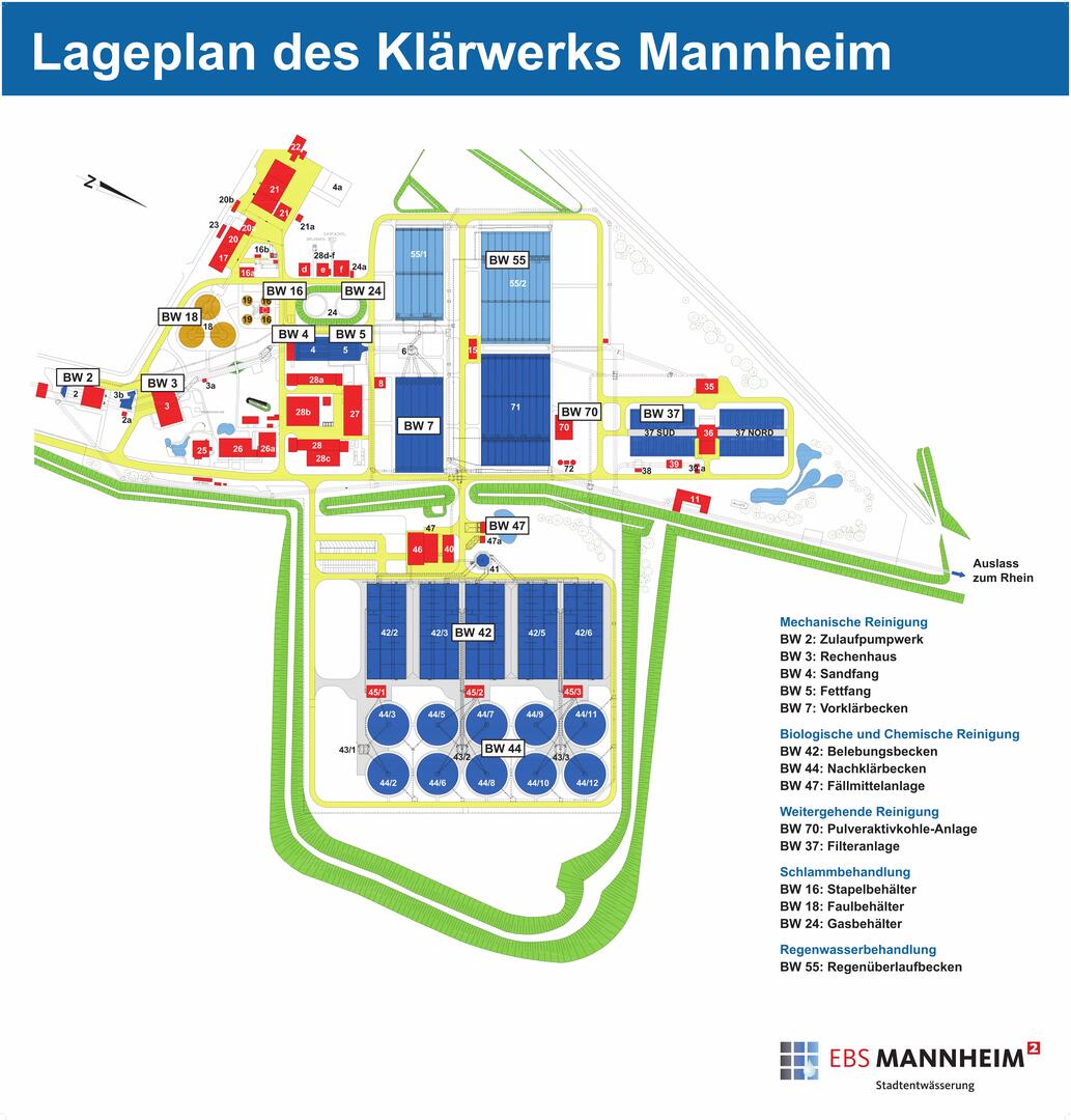 Mithilfe von aufwändigen Verfahren wird das Abwasser der Stadt Mannheim weitgehend von Schadstoffen, Nährstoffen und Spurenstoffen befreit, bevor es in den Vorfluter Rhein fließt.