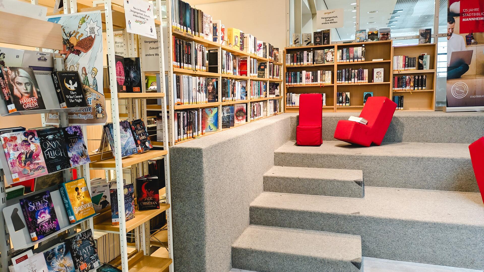 Willkommen im JungLe+, dem Bereich für junge Leute ab 14 in der Zentralbibliothek Mannheim! Der JungLe+ ist Treffpunkt, Aufenthaltsort und Raum für Gaming, Lesen und Lernen.