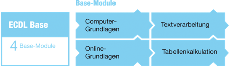 Der ECDL-Base wird von den meisten Teilnehmern angestrebt. Er setzt sich aus den vier Modulen Computergrundlagen, Textverarbeitung, Online-Grundlagen und Tabellen-kalkulation zusammen. Im Gegensatz zu früheren Regelungen gibt es nun keine Wahlmöglichkeit mehr.