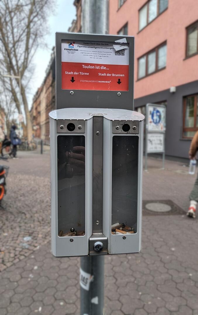 Insgesamt etwa ein Dutzend Voting-Aschenbecher sind im Stadtgebiet und an Haltestellen der rnv aufgestellt, für deren Wartung und Entleerung wir sorgen. Regelmäßig wechselnde Fragen sollen Raucher dazu animieren, mit ihrer Zigarettenkippe Fragen zu beantworten oder abzustimmen. Einige dieser Voting-Aschenbecher sind im Rahmen des deutsch-französischen Jugendprojekts #keepitclean aufgestellt worden. Mit der Zigarettenkippe können an diesen Aschenbechern Fragen zur Partnerstadt Toulon beantwortet werden. Für den Austausch der Fragen der Voting-Aschenbecher kann eine Patenschaft vereinbart werden. Als Pate tauschen Sie regelmäßig die Fragen aus, sodasss die Nutzung der Voting-Aschenbecher für Rauchende weiter spannend bleibt.