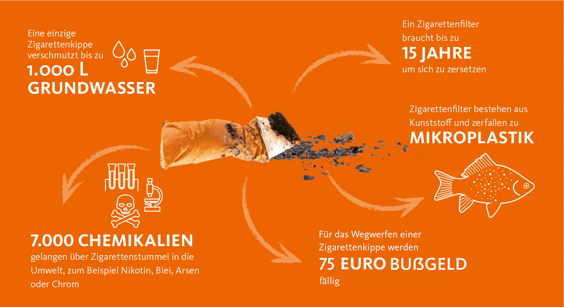 Dabei sind Zigarettenkippen eine besondere Gefahr für Mensch und Umwelt, die vielfach unterschätzt wird. Alleine im Filter sind neben einer Vielzahl von Giftstoffen auch rund 50 krebserregende Substanzen enthalten, die durch Nässe herausgelöst werden. Der Filter besteht aus Kunststoff, der in der Umwelt zerfasert und zu Mikroplastik wird.