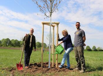 Von links nach rechts: Bürgermeister Dirk Grunert, Baumspenderin Marion Pedak mit Sohn.