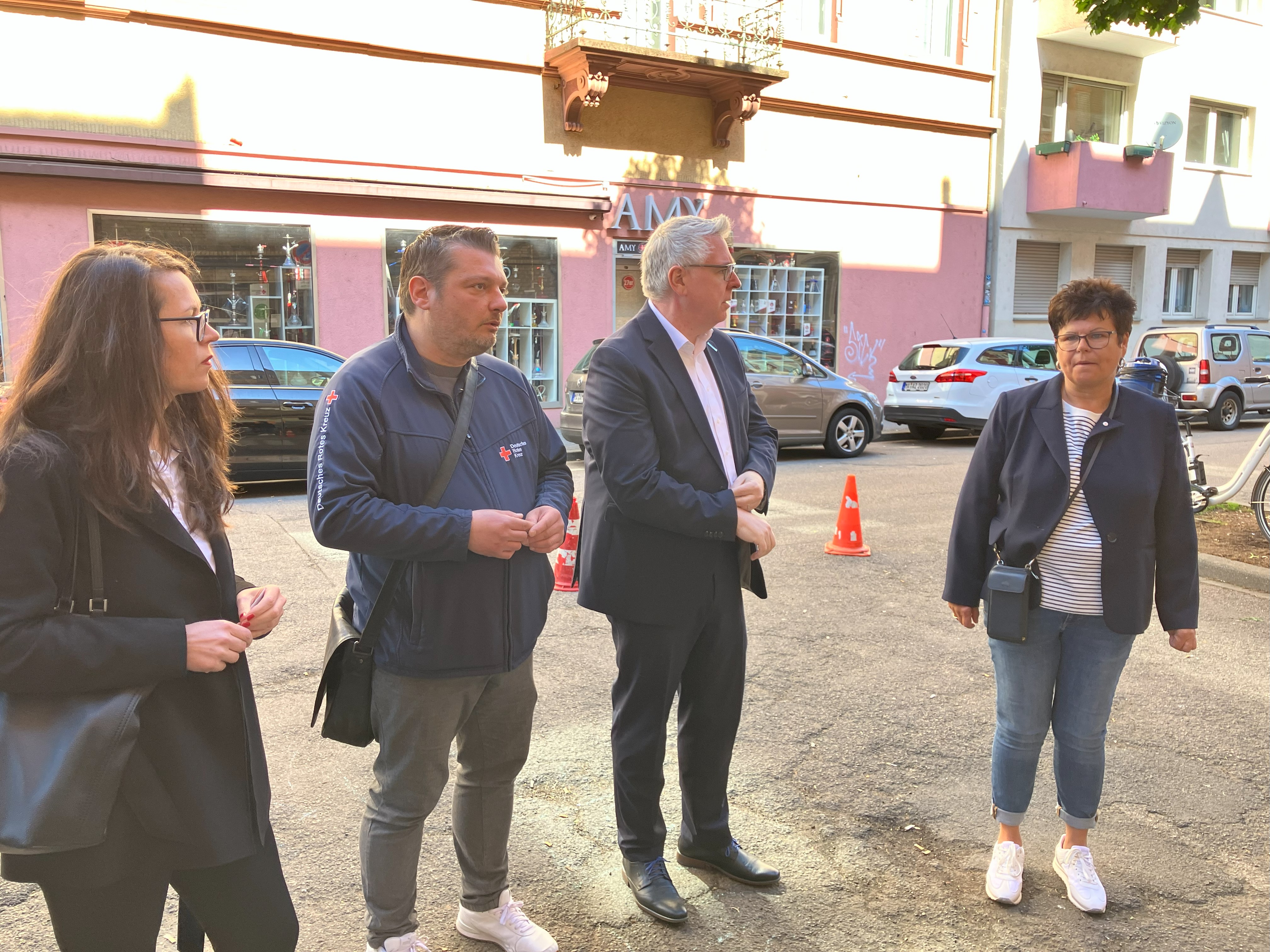 V.l.n.r. Bezirksbürgerserviceleiterin Olita Steger, Manuel Wamser, Leiter der DRK-Einrichtungen Tafel und Second Hand, Bürgermeister Thorsten Riehle und Christiane Hammoudi, Geschäftsführerin DRK Kreisverband Mannheim e.V., vor der Tafel in der Alphornstraße.