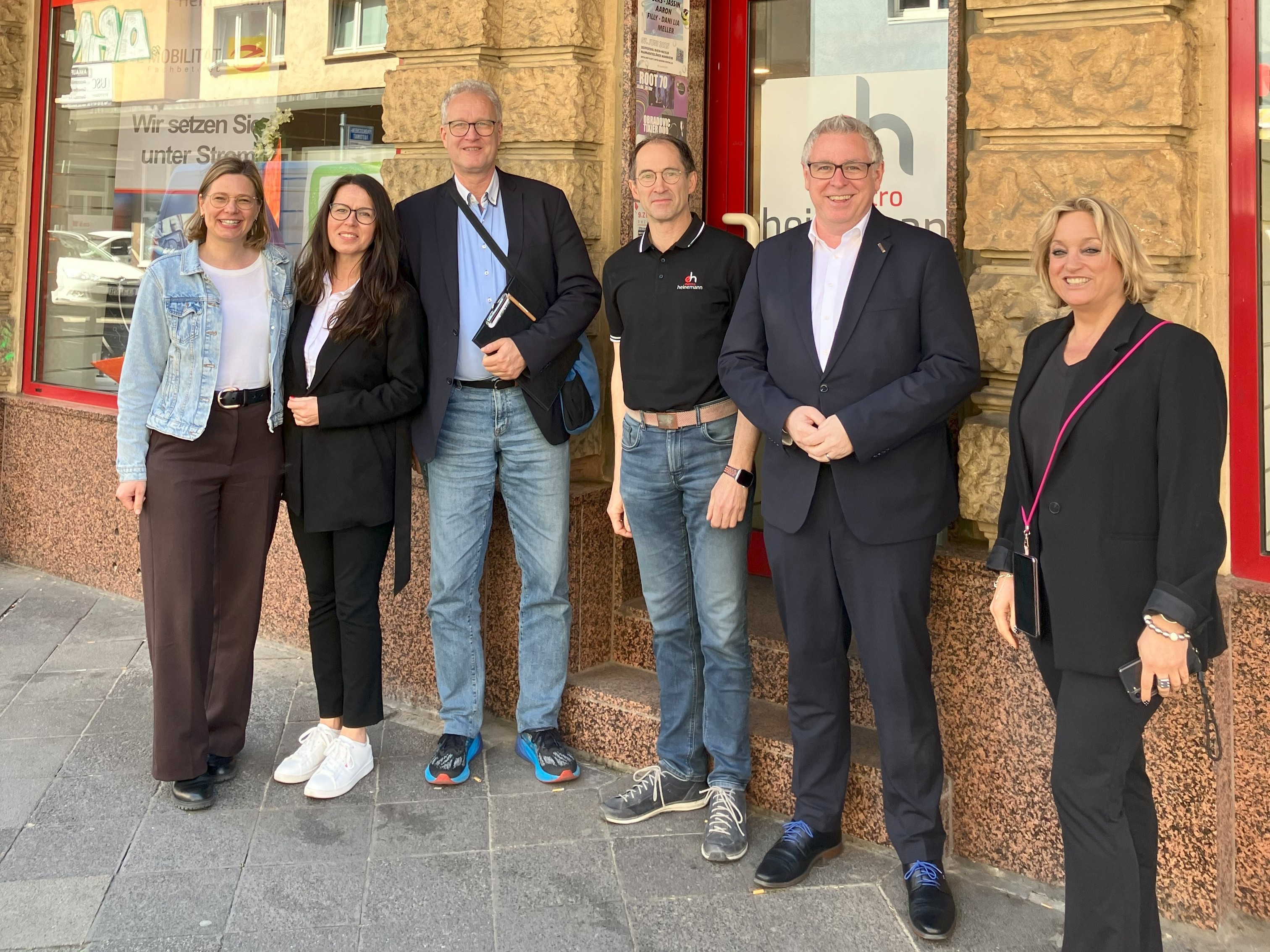 V.l.n.r. Lena Kamrad, Büroleiterin Dezernat 2, Olita Steger, Bezirksbürgerserviceleiterin, Michael Müller, KMU-Betreuer Nord, Oliver Fassoth, Geschäftsführer Elektro Heinemann, Thorsten Riehle, Bürgermeister für Wirtschaft, Arbeit, Soziales und Kultur, und Jennifer Pohl, Quartiermanagerin Neckarstadt-West, vor dem Geschäft Elektro Heinemann.
