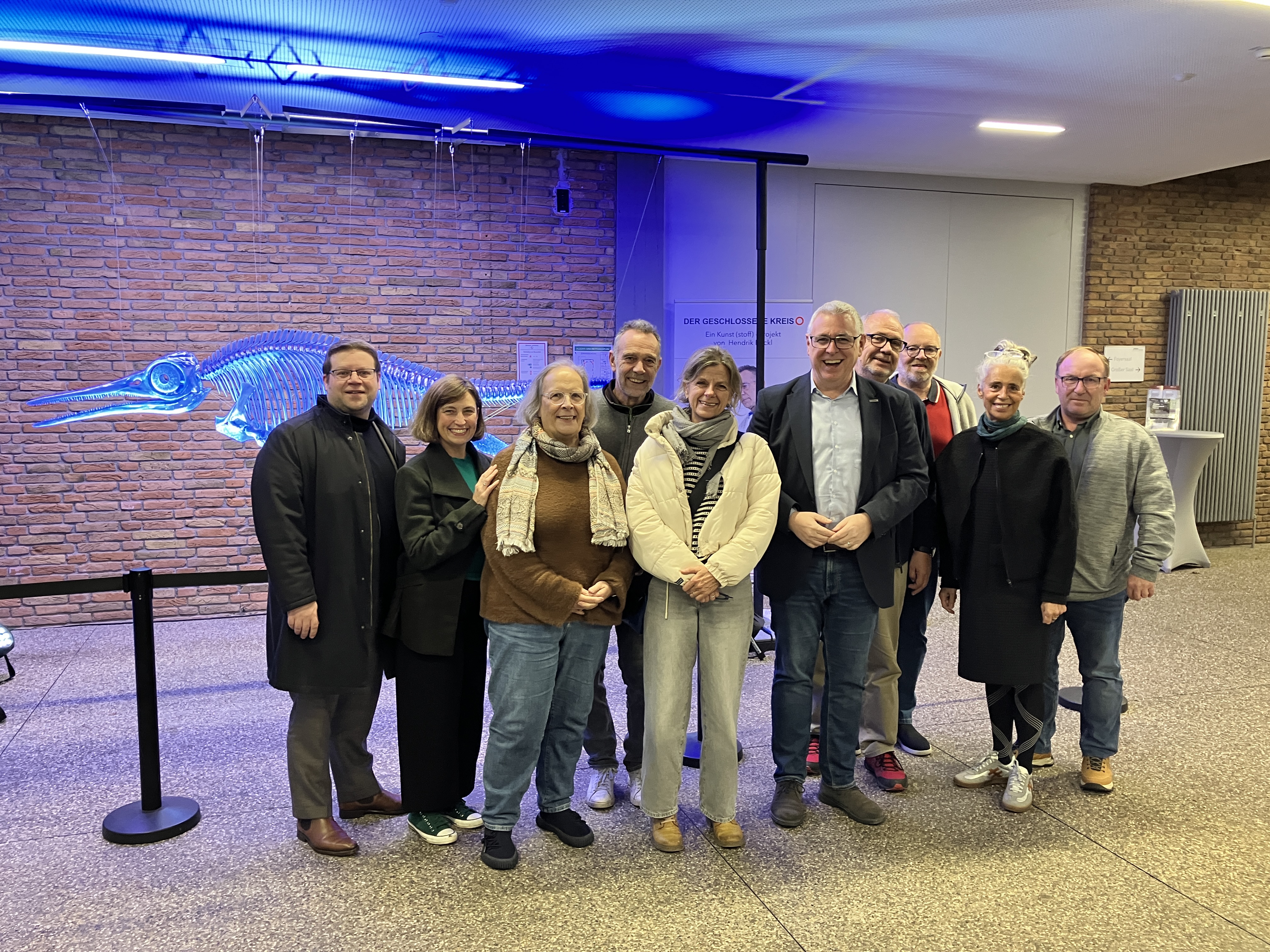 Bei dem Stadtteiltag besuchte Bürgermeister Riehle auch das Kulturhauses zu einem Gespräch mit Ute Mocker, Leiterin des Kulturhauses, (hier 3. von links) sowie verschiedenen Künstler*innen und Kulturschaffenden in Käfertal, wie den Vereinen Trommelpalast und Löwenjäger. Die Gruppe steht vor einem Ichthyosaurus des Kunst-Projekts "Der geschlossene Kreis" des Mannheimer Künstlers Hendrik Hackl (hier 4. von links).