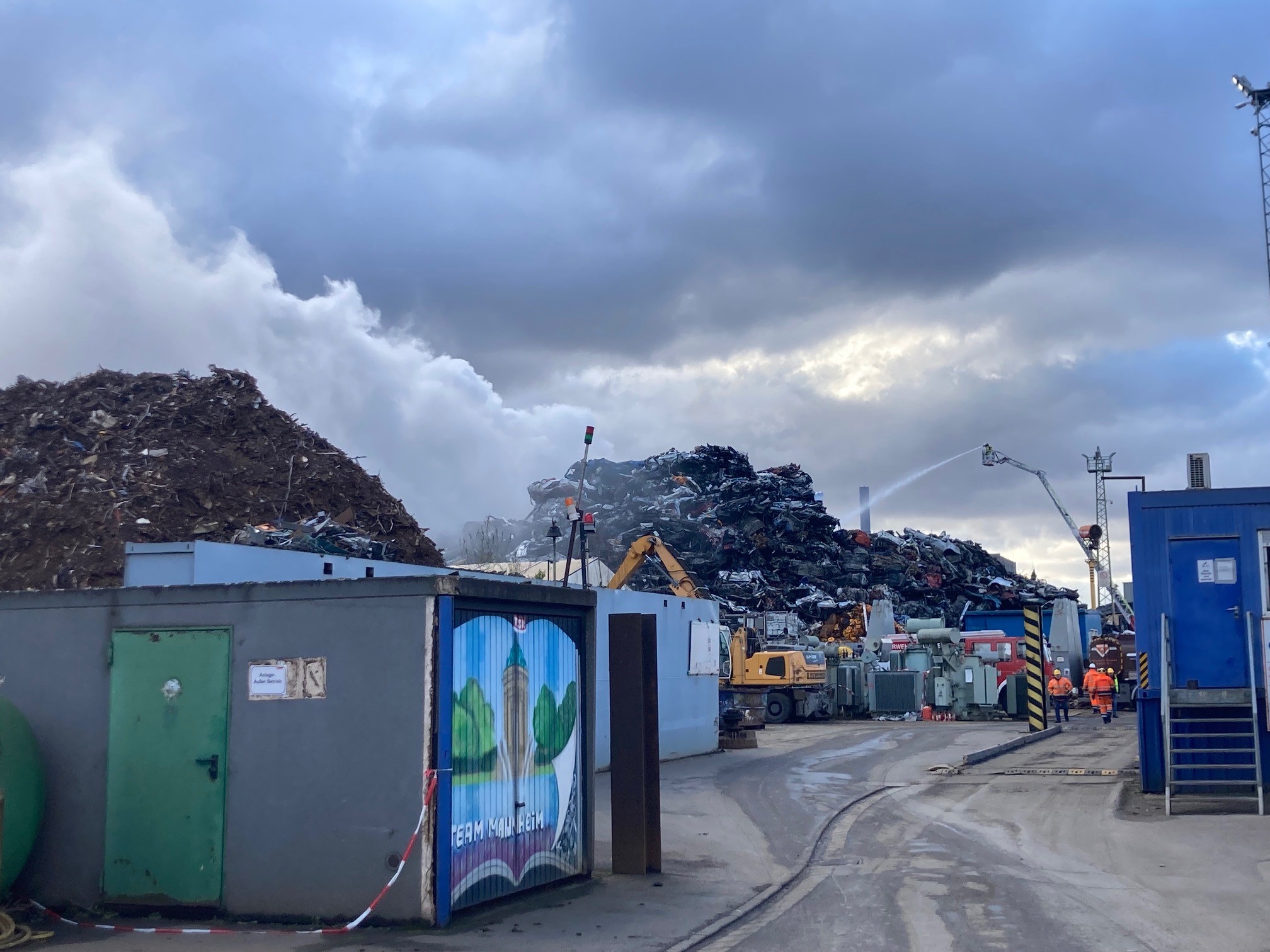 • Rund 700 Kubikmeter Misch-Schrott waren aus noch ungeklärter Ursache in Brand geraten.