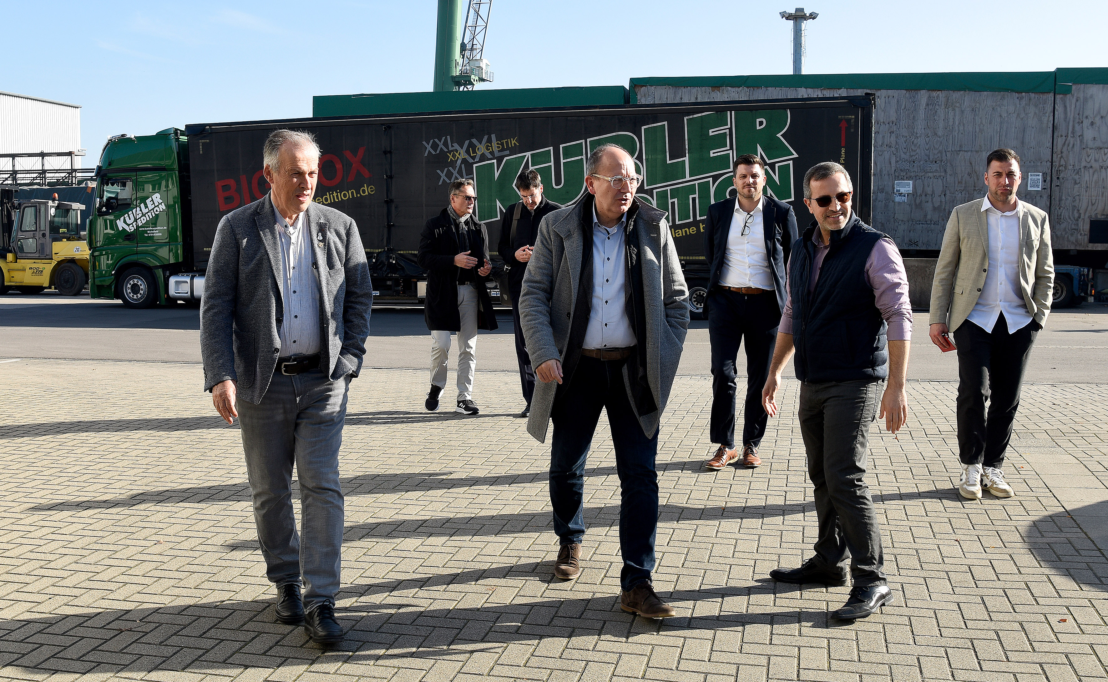 Bürgemeister Ralf Eisenhauer (5. v.l.), GBG-Geschäftsführer Karl-Heinz Frings (5. v.r.) und Bereichsleiter Ed. Züblin AG Roland Hakenjos (2. v.r.) feiern mit Vertretern des Stadtraumservice und des Gemeinderats den Spatenstich zum Grünen Betriebshof auf Spinelli.