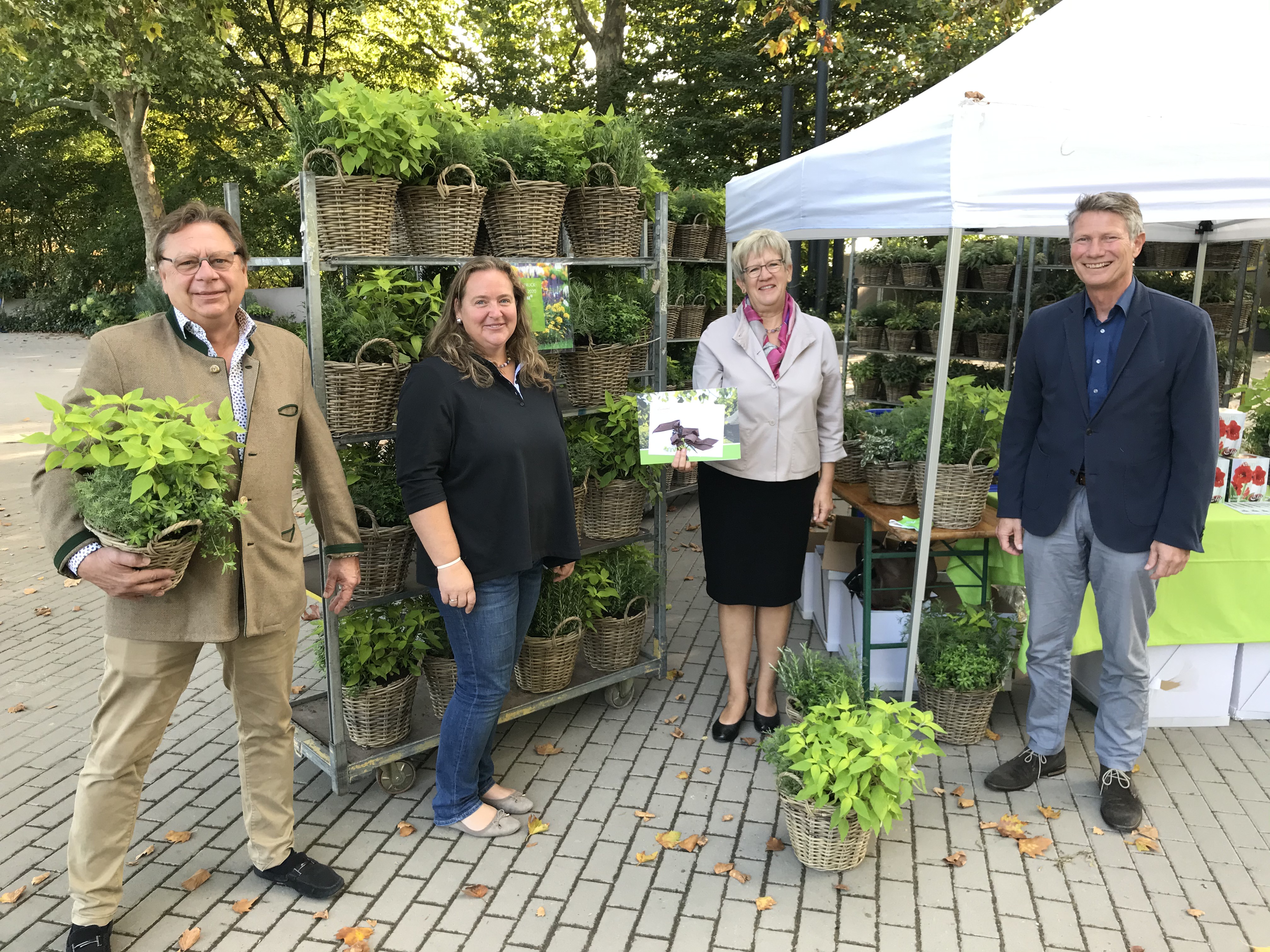 Bürgermeisterin Felicitas Kubala (r.) übergibt Claudia Schulz den Hauptpreis des diesjährigen Blumenschmuckwettbewerbs. Ebenfalls zu sehen: Bernd Otto (l.), Vorsitzender des Kreisgartenbauverbandes und Markus Roeingh, Leiter Eigenbetrieb Stadtraumservice.