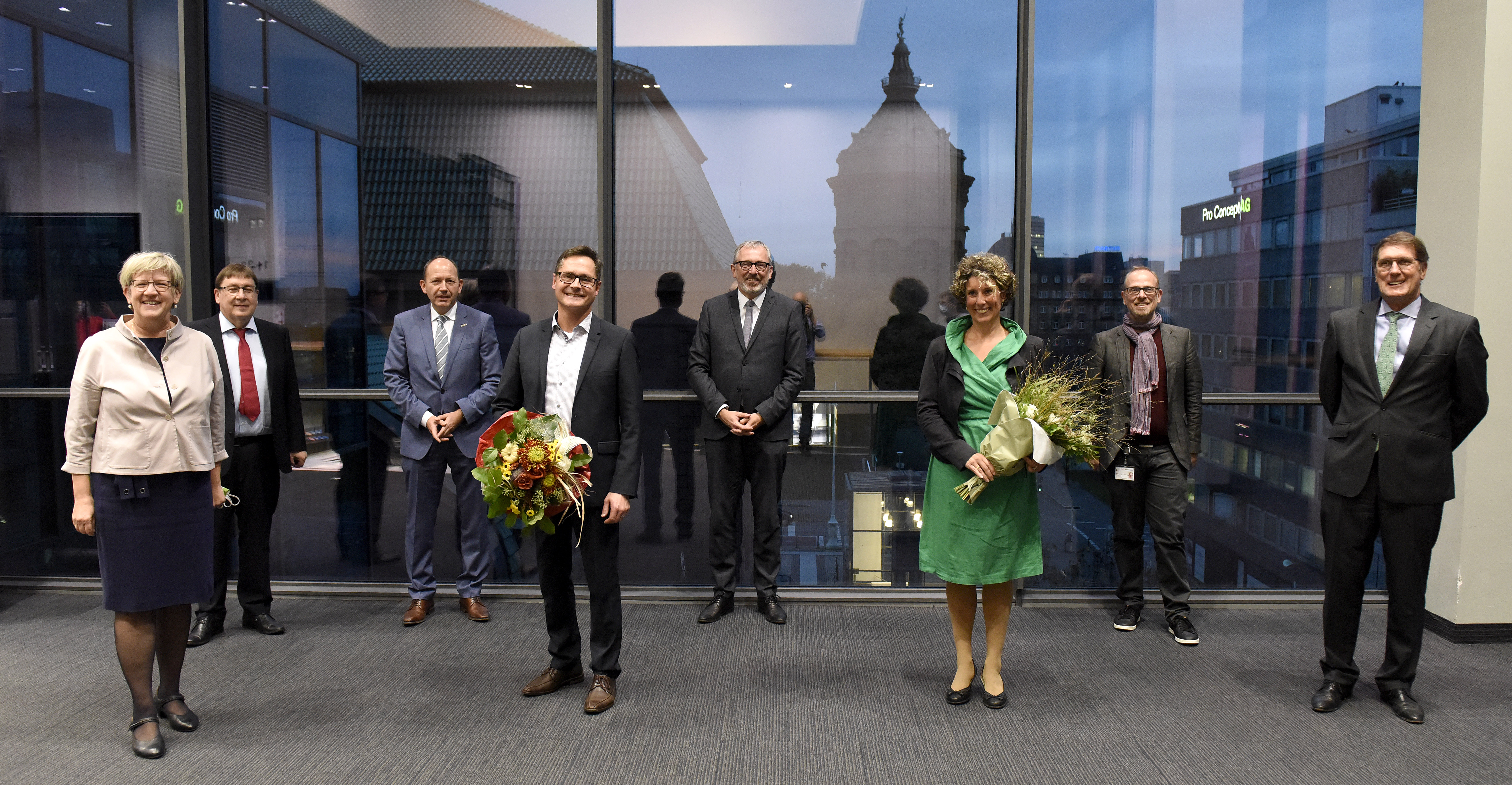 Unser Bild zeigt Prof. Dr. Diana Pretzell, neue Bürgermeisterin für Bürgerservice, Klima- und Umweltschutz sowie technische Betriebe in Mannheim und Ralf Eisenhauer,neuer Bürgermeister für Bauen, Planung, Verkehr und Sport in Mannheim, zusammen mit Oberbürgermeister Dr. Peter Kurz und den derzeit amtierenden Dezernent*innen