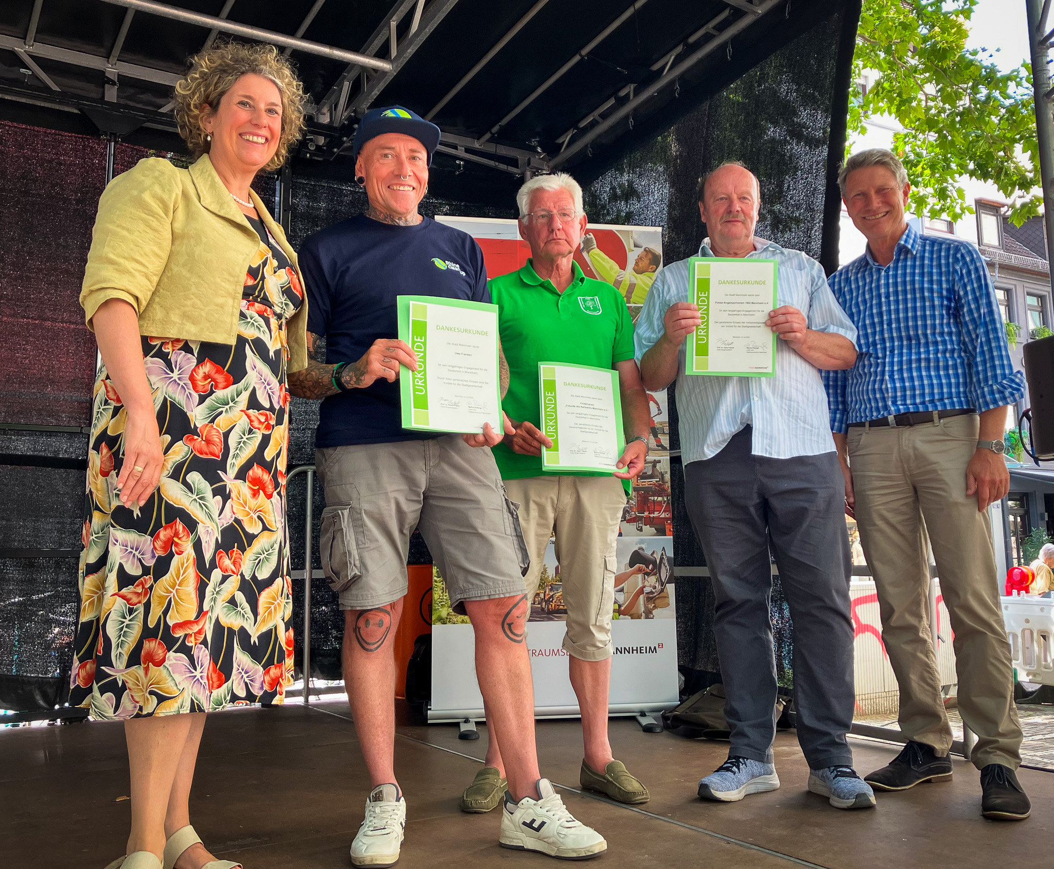 Erste Bürgermeisterin Prof. Dr. Diana Pretzell und Eigenbetriebsleiter Markus Roeingh (rechts) vergeben die Sonderpreise für die Personen und Vereine, die sich in besonderer Weise für Sauberkeit in der Stadt einsetzen, v.l.: