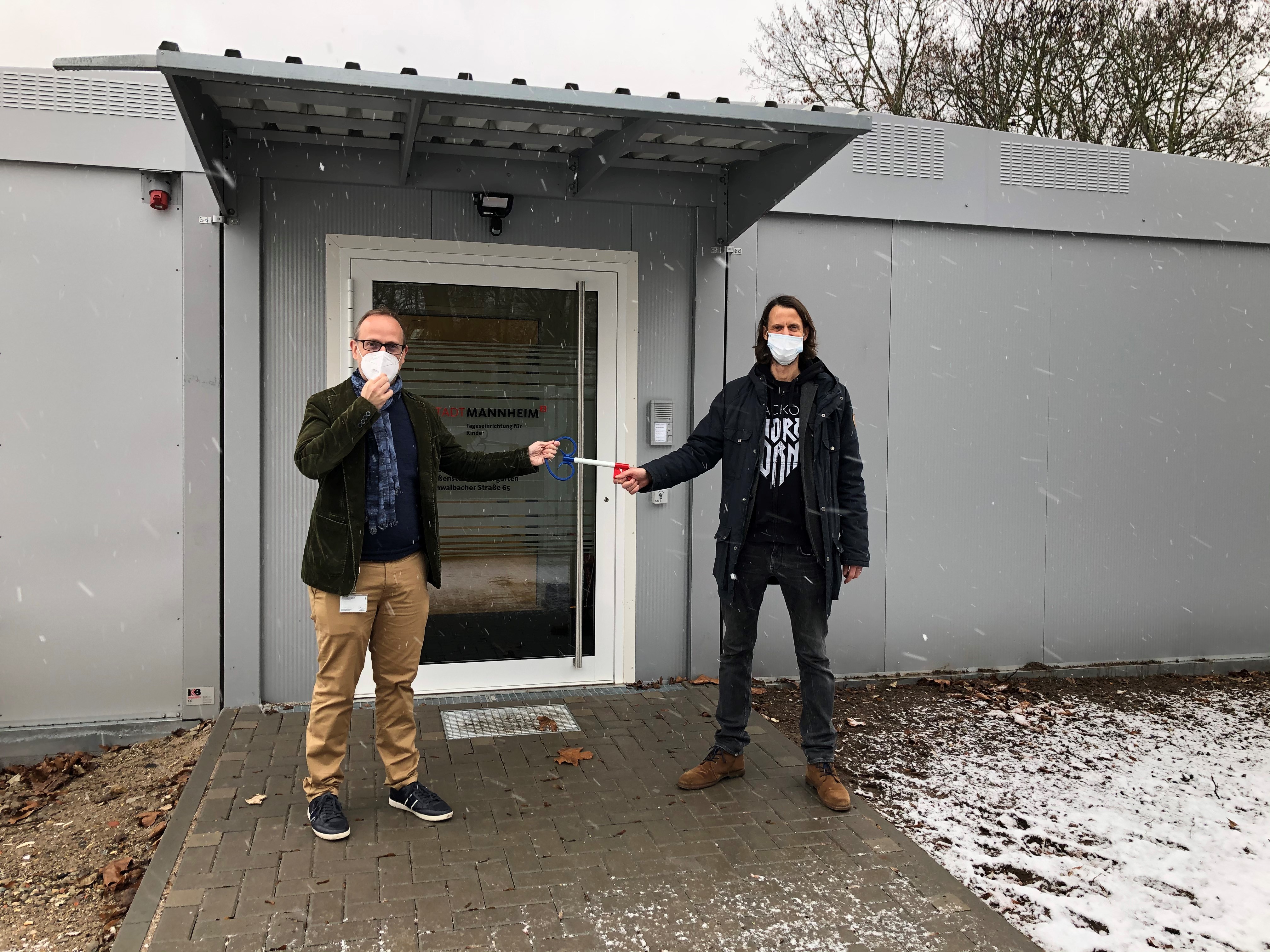 Bürgermeister Dirk Grunert übergab heute offiziell den Schlüssel zur Eröffnung der neuen Außenstelle des Kinderhauses Friedrich-Ebert an den Einrichtungsleiter Steffen Herrmann.