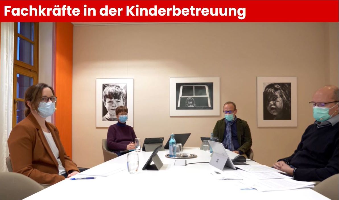 Bildungsbürgermeister Dirk Grunert (3.v.l) beantwortet im Online-Dialog gemeinsamt dem Leiter des Fachbereichs Jugendamt und Gesundheitsamt Dr. Peter Schäfer (rechts), der Leiterin des Fachbereichs Tageseinrichtungen für Kinder, Sabine Gaidetzka (2.v.l.) und Moderatorin Lisa Weindorf (links) die Fragen der Zuschauer*innen.