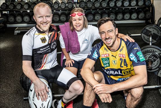 Die „Gesichter der Spiele“ freuen sich auf das Sportfest für Menschen mit geistiger Behinderung 2022 in Mannheim (von rechts): Rhein-Neckar Löwe Patrick Groetzki, die SOBW-Athleten Jennifer Kurz (Schwimmen) und Michael Lofink (Radfahren).
