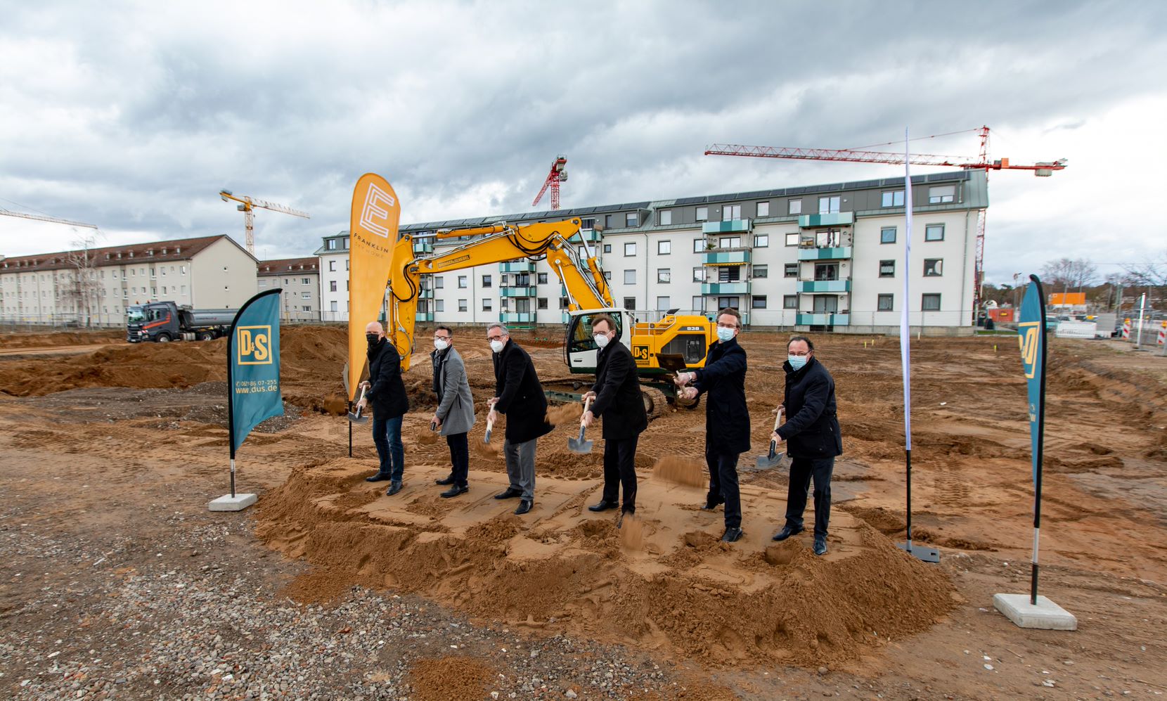 Begingen den symbolischen Spatenstich (von links): Achim Judt (Geschäftsführer MWSP), Baubürgermeister Ralf Eisenhauer, Oberbürgermeister Dr. Peter Kurz, Karl-Heinz Frings (Geschäftsführer GBG), Martin Teigeler (Geschäftsführer AS-P/Architekturbüro) sowie Karlheinz Heffner (geschäftsführender Gesellschafter DIRINGER & SCHEIDEL).
