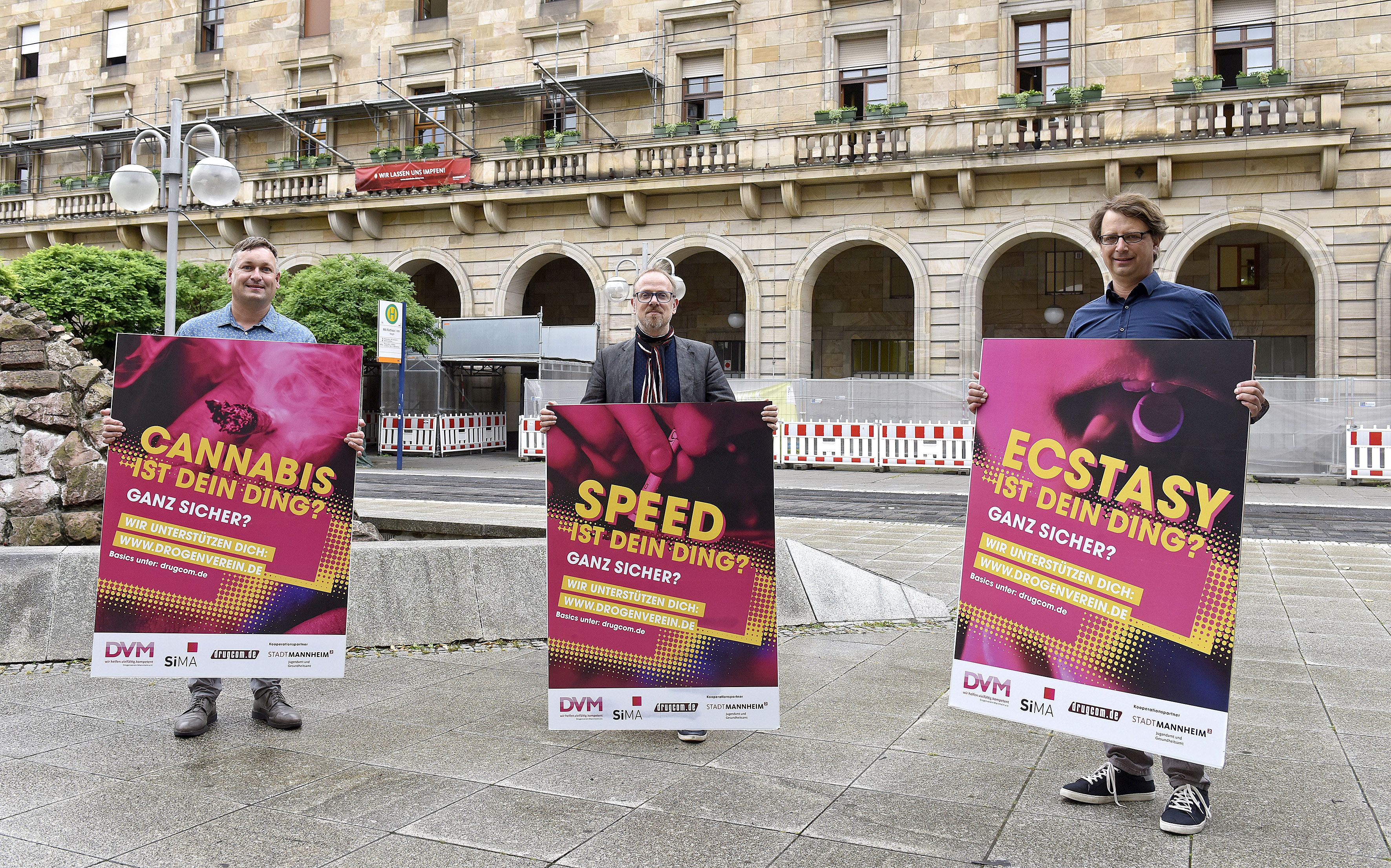 Gesundheitsbürgermeister Dirk Grunert, Philip Gerber, Geschäftsführer des Drogenvereins Mannheim und Dr. Timo Kläser, Beauftragter für Suchtprävention der Stadt Mannheim haben anlässlich des Weltdrogentages über das Thema Drogensucht, die Mannheimer Plakatkampagne und die örtlichen Hilfsangebote für Betroffene informiert.