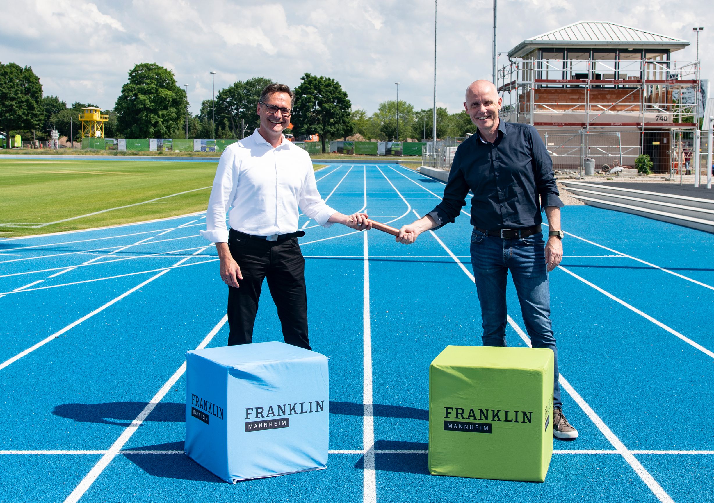 Symbolische Staffelübergabe der FRANKLIN-Sportanlage an die Stadt Mannheim (von links): Sportbürgermeister Ralf Eisenhauer und MWSP-Geschäftsführer Achim Judt.