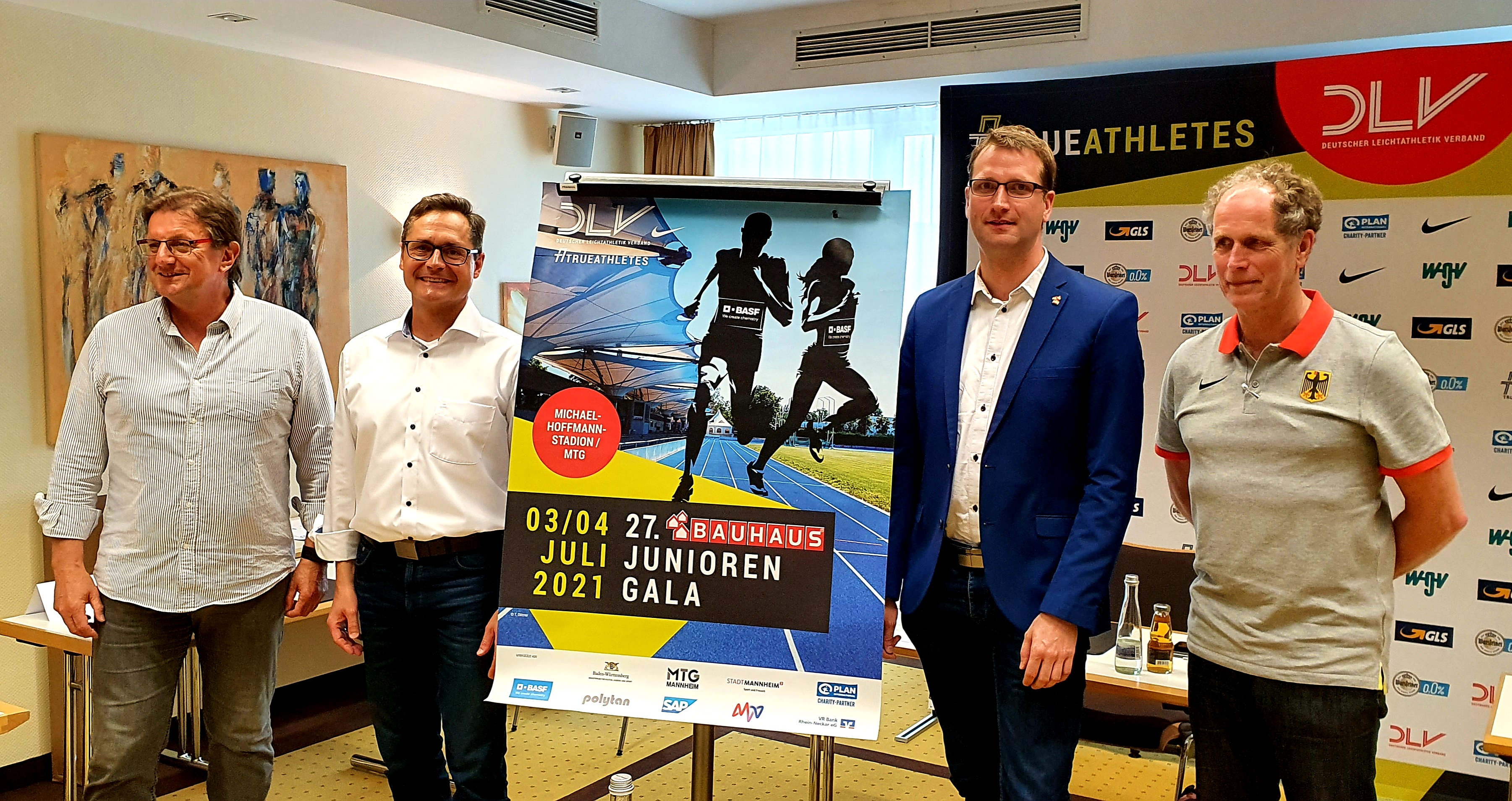 Freuen sich gemeinsam auf die 27. Juniorengala (von links): MTG-Organisator Rüdiger Harksen, Sportbürgermeister Ralf Eisenhauer, Manuel Löhmann vom Hauptsponsor Bauhaus und DLV-Chef-Bundestrainer Dietmar Chounard.