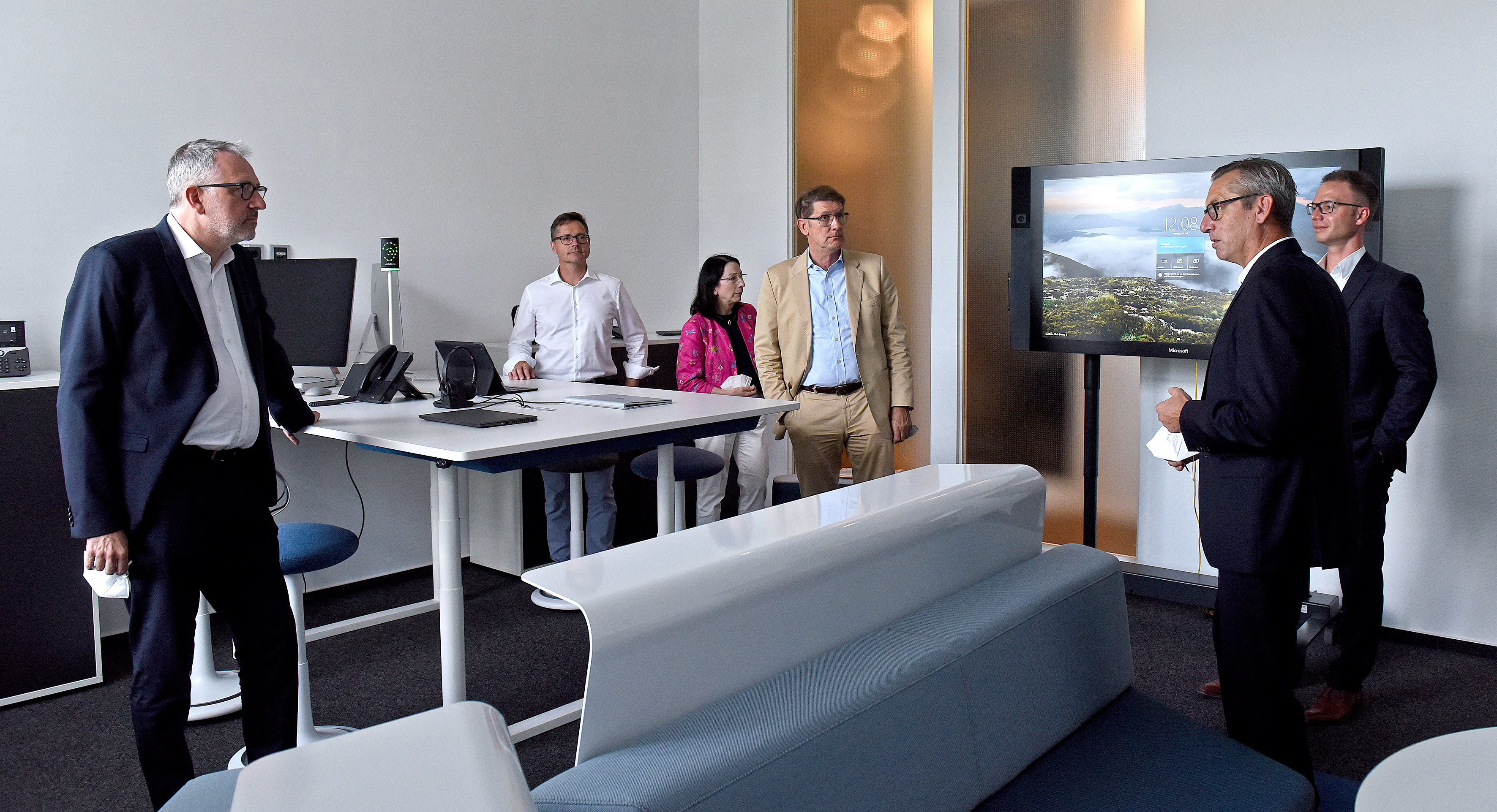 Stephan Mauer, Geschäftsführer des Bechtle IT-Systemhaus Mannheim (2.v.r.), und Helge Höhn, Dienstleistungsleiter Business Services bei Bechtle (1.v.r.), demonstrieren Oberbürgermeister Dr. Peter Kurz, Baubürgermeister Ralf Eisenhauer, der Fachbereichsleiterin der Wirtschaftsförderung Mannheim, Christiane Ram, und Wirtschaftsbürgermeister Michael Grötsch ihre digitalen Kommunikationsmöglichkeiten.