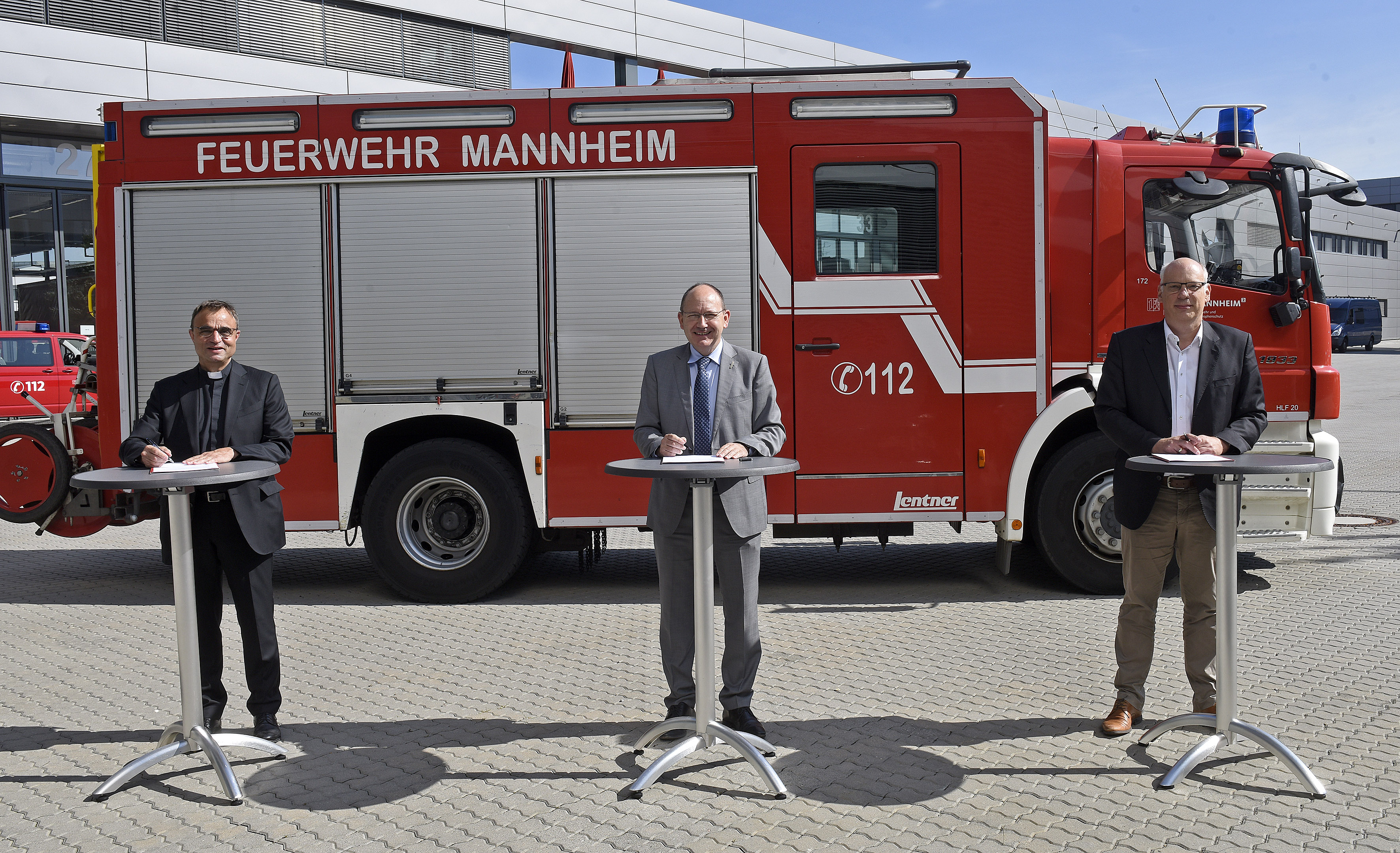 Dekan Karl Jung, Erster Bürgermeister Christian Specht und Dekan Ralph Hartmann (v.l.n.r.) bei der Unterzeichnung des Notfallseelsorge-Vertrags auf dem Hof der Hauptfeuerwache in Neckarau.