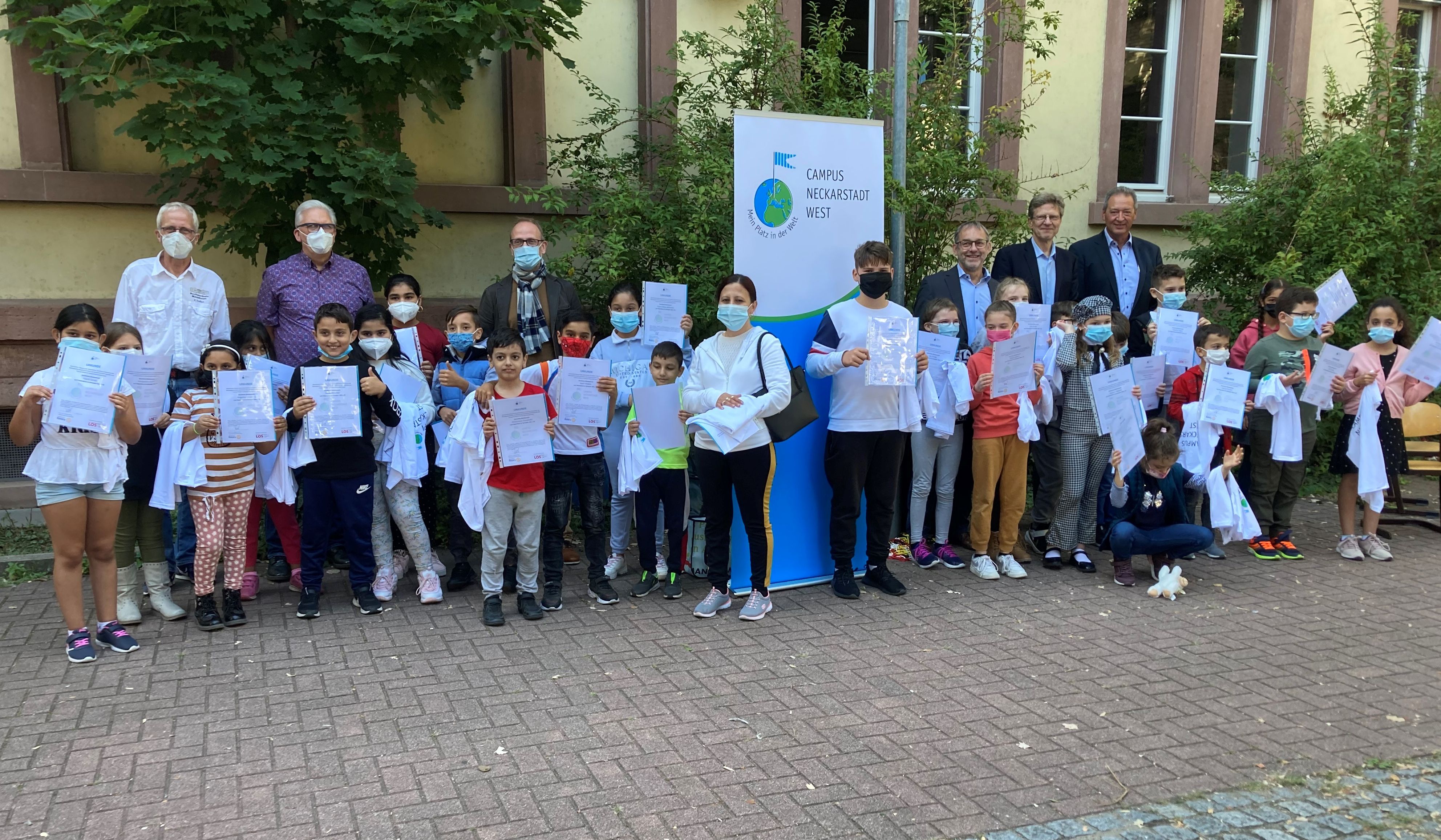 Stipendien-Übergabe für Campus-Kinder: Heute übergaben die Mannheimer Rotarier-Vereinigugen Stipendien an die Kinder des Campus Neckarstadt-West. Der Förderverein Campus Neckarstadt-West steuerte T-Shirts bei. Bildungsbürgermeister Dirk Grunert (Mitte) dankte den Spendern.